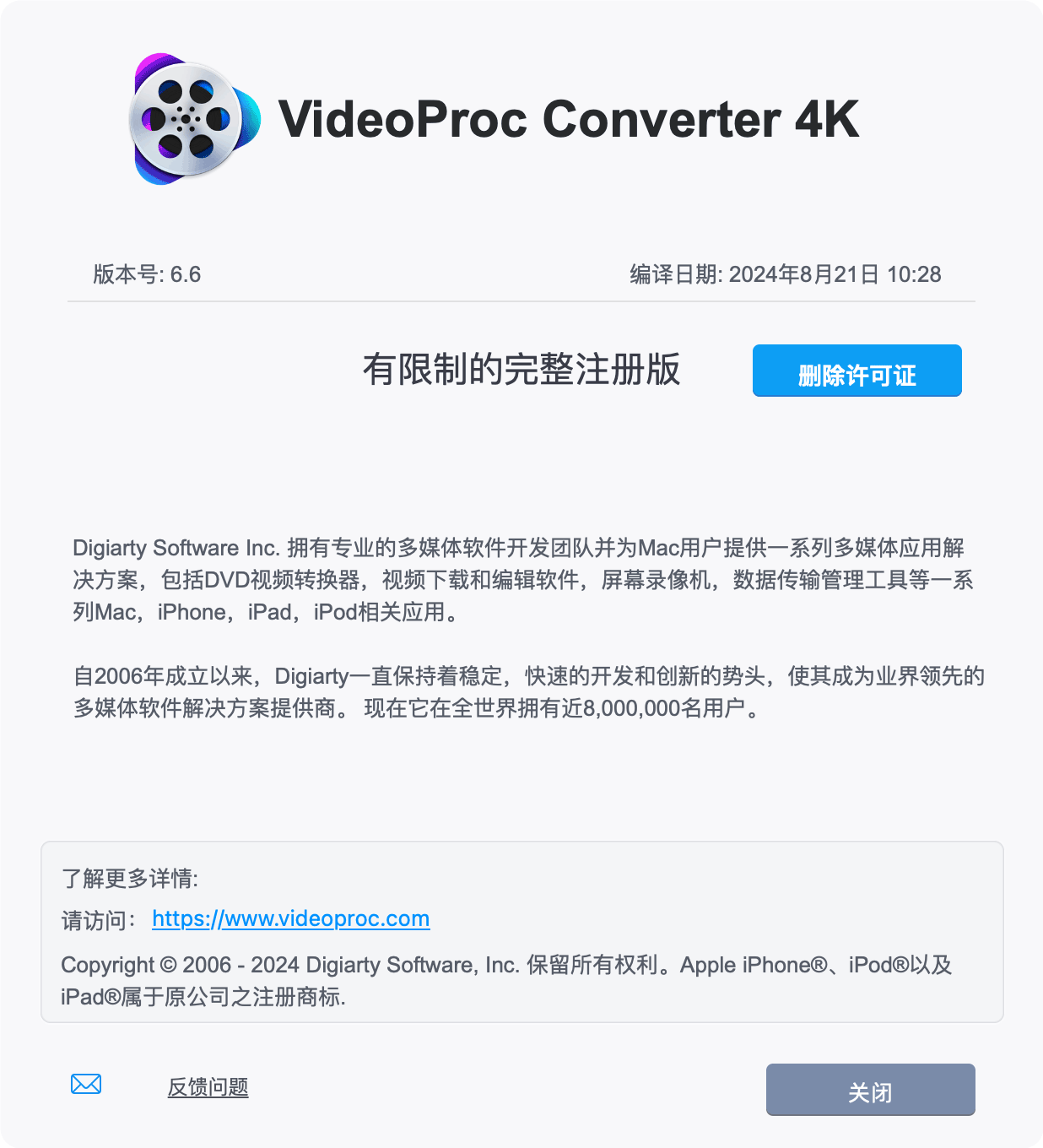 VideoProc 4K for mac一站式视频处理软件,VideoProc 4K 破解版支持多达370个编解码器,可以接受任何视频格式,并且可以轻松执行视频转换任务。iPhone,Android,相机,无人机或GoPro的所有视频都将得到流畅处理,同时保持最佳质量。测试环境:MacOS 14.6.1