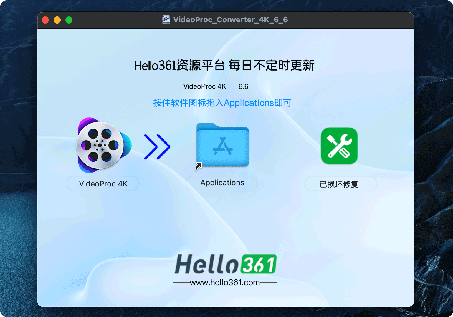 下载完成后,拖动左侧的VideoProc4K到右侧应用程序中即可