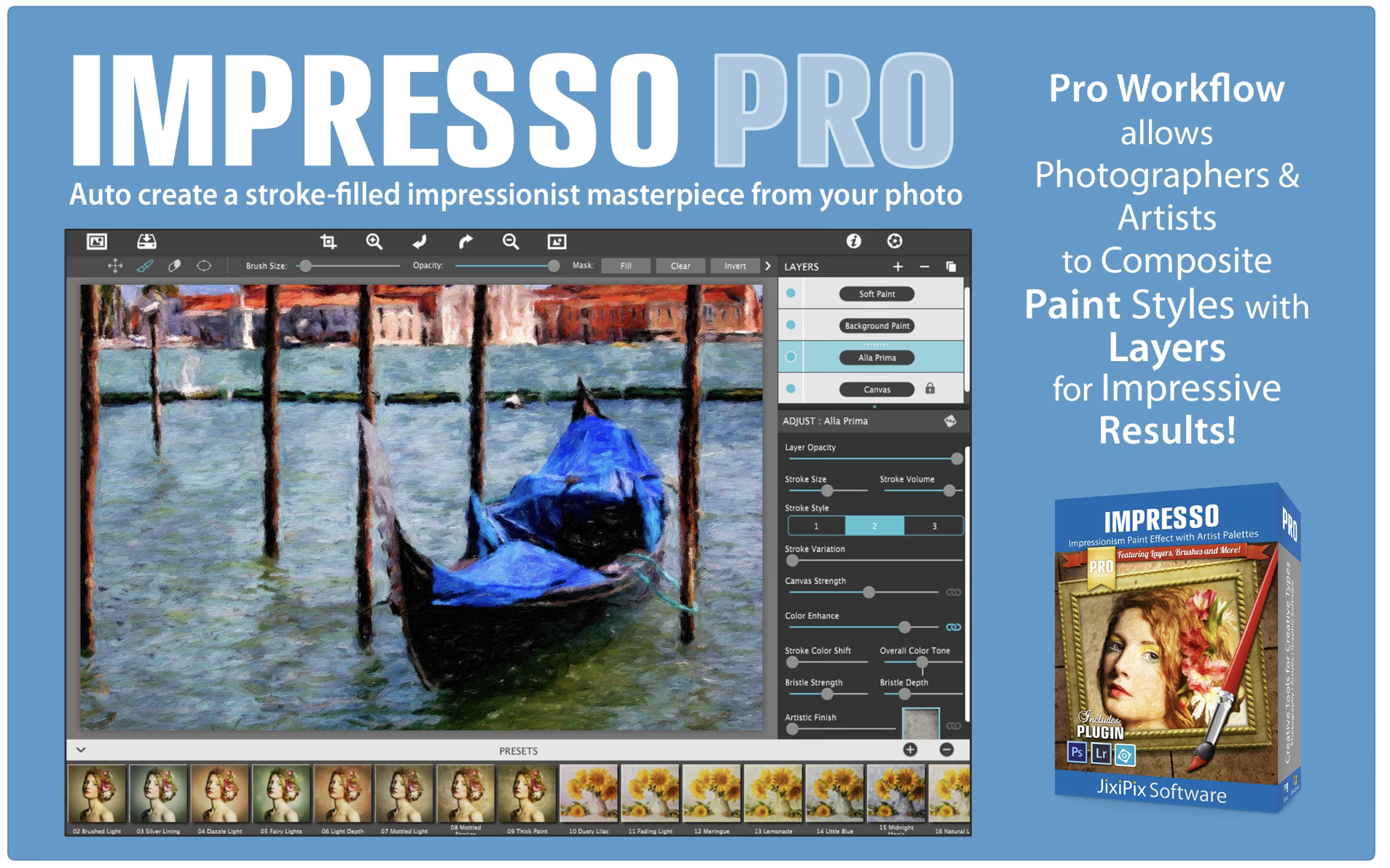 JixiPix Impresso Pro是一款油画滤镜软件,可将照片转化为油画绘画效果,Impresso Pro将油漆效果与图层和画笔相结合,创作出漂亮的图像作品。Impresso Pro还包括Photoshop,Elements,Lightroom和PAIntShop Pro的插件,让你在专业的设计软件上使用。