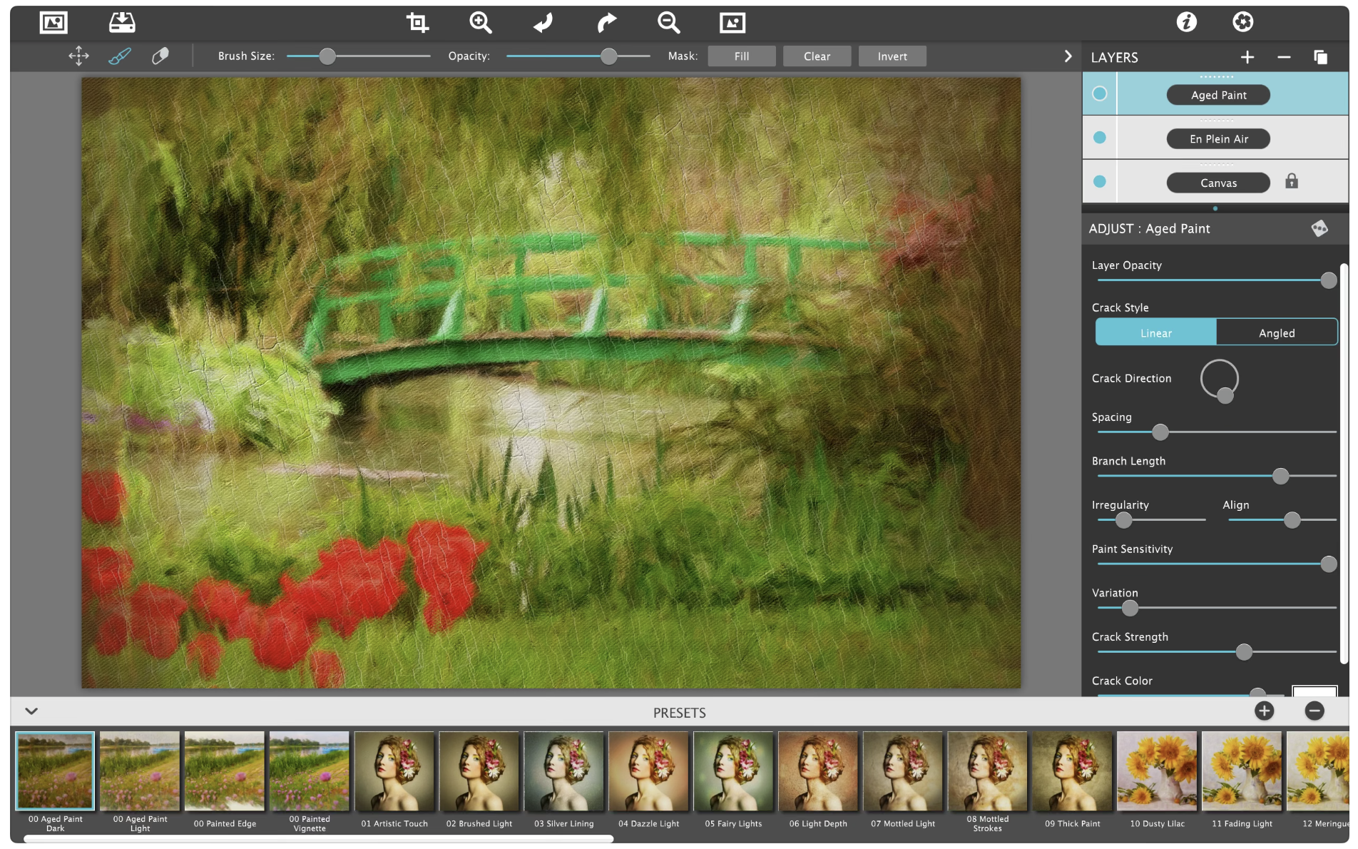 智能图层和画笔,用于混合多种颜色样式,边缘库与画布完美融合,背景涂料效果可创建距离,用于增强前景主体的柔和涂料效果,用于添加裂纹纹理的Aged Paint效果,称为Tache的印象主义效果,以便用残缺的画笔描边和颜色来描绘画作。
