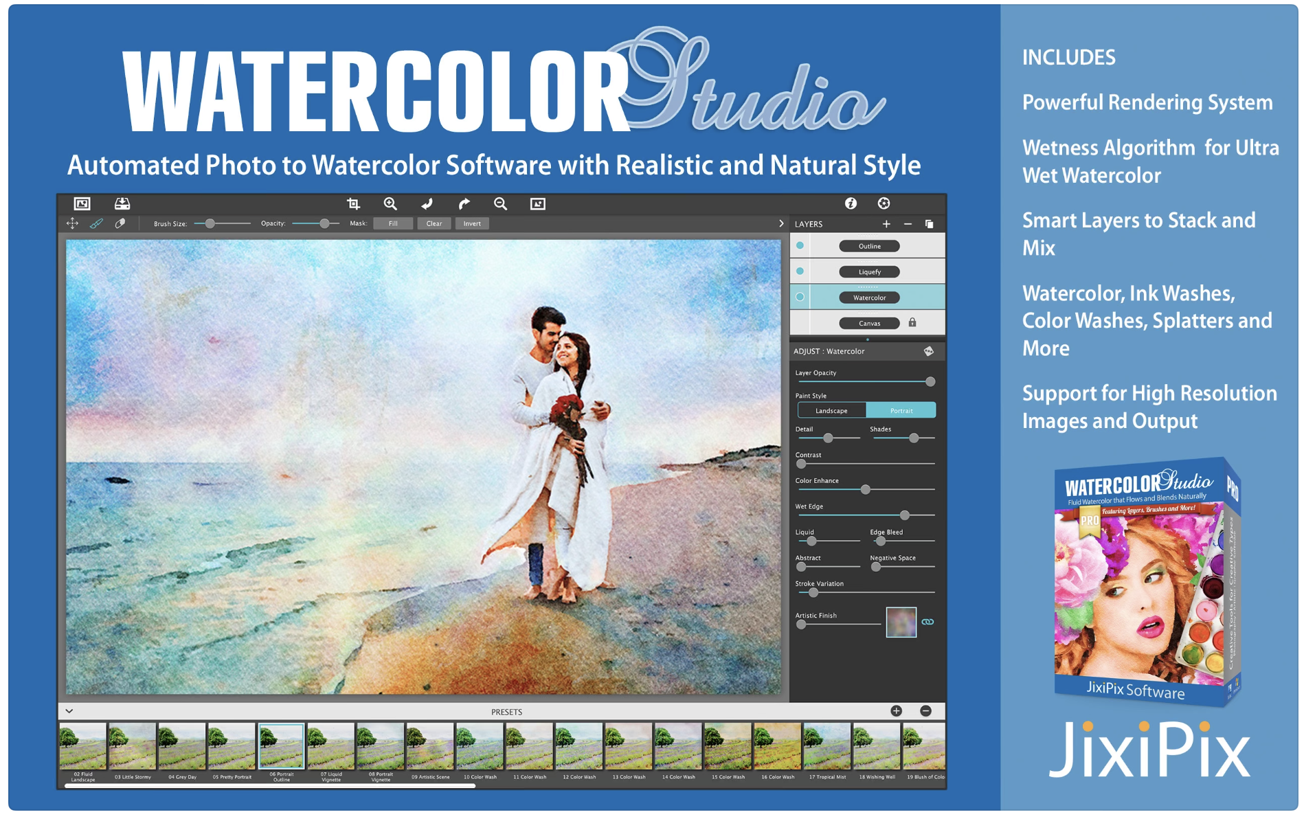 Jixipix Watercolor Studio Pro for Mac是具有逼真的自然风格的自动水彩软件照片。Watercolor Studio使用自然流动的颜料创建流畅,液态,半透明的水彩画。该应用程序建立在使用现实技术的令人难以置信的渲染系统的顶部,可以完成初始工作,立即生成水彩,然后允许您使用一系列滑块,图层,画笔,颜色清洗和艺术效果自定义绘画。最终结果是打印质量的水彩画,充满了透明的光度和纯粹的美感。