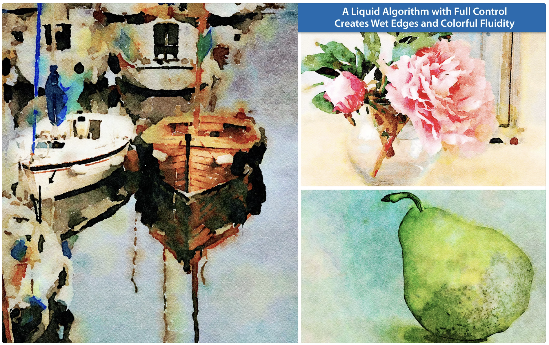 执行良好的水彩画的美来自于纸上颜料的透明度。它还来自于水彩画独特的自由流动特性。Watercolor Studio使用一种“液体”滑块即可轻松完成此操作。移动时,请注意整个绘画中的颜色渗出,以形成超湿的风格。或使用“湿边”滑块定义带有堆积的颜料和颜色的边缘,这些颜料和颜色会自然向内渗出。