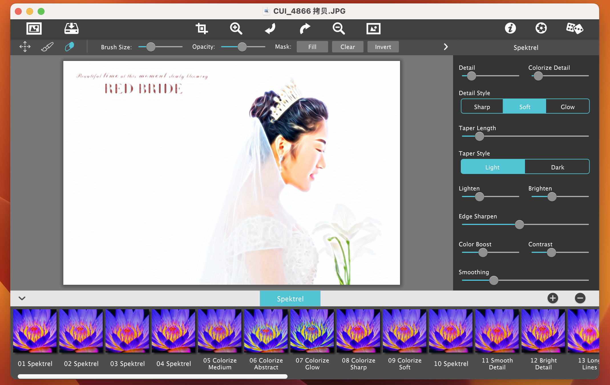 JixiPix Spektrel Art 是Mac上的一款图片锐化工具,为使用者提供了直观、强大的修图功能,支持一键添加照片滤镜、闪烁效果,或者对图片进行锐化、调整照片亮度等,可以满足不同用户对图片的处理需要,让你修复更加轻松、简单。