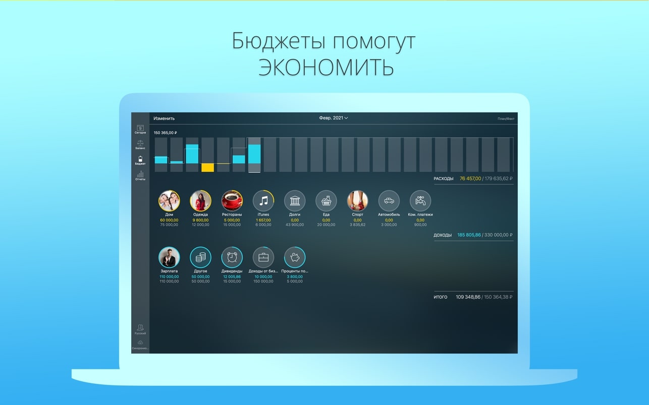 – 为收入和支出创建预算条目,并指定每个条目的预算限值。