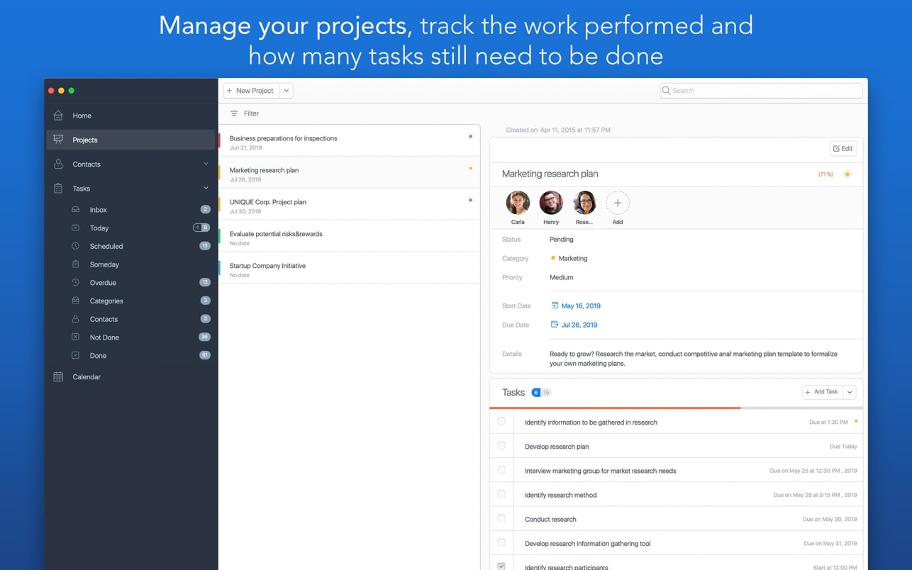 – 在主屏幕上开始规划新的一天,在这里你可以找到你现在的项目和代办事项:时间轴上有您为今天规划的任务和即将开始的任务大纲。主屏幕能够使您只集中在现在的任务上,着眼今日,就不会迷失在众多的其他任务中。直接在主屏幕中建立新的任务、项目、联系人和公司就可以规划您的一天了。