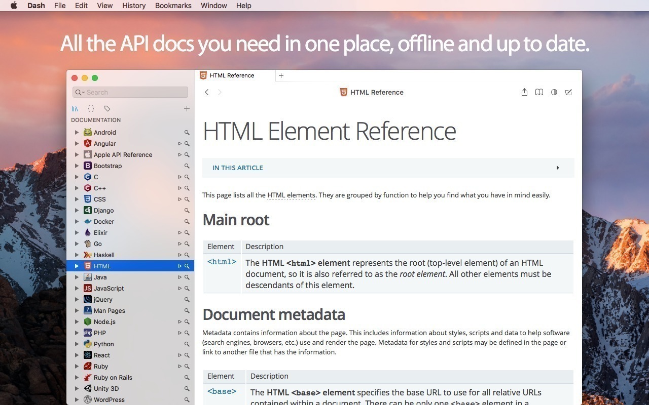 离线文档:iOS、macOS、watchOS、tvOS、Swift、Man Pages、.NET Framework、ActionScript、Akka、Android、AngularJS、Angular.dart、Ansible、Apache、Appcelerator Titanium、AppleScript、Arduino、Backbone、Bash、Boost、Bootstrap , Bourbon, Bourbon Neat, C, C++, CakePHP, Cappuccino, Chai, Chef, Clojure, CMake, Cocos2D, Cocos2D-X, CodeIgniter, CoffeeScript, ColdFusion, Common Lisp, Compass, Cordova, Corona, CSS, D3.js, Dart , Django, Dojo Toolkit, Drupal, ElasticSearch, Elixir, Emacs Lisp, Ember.js, Emmet.io, Erlang, Express.js, 表达式引擎, ExtJS, Flask, Font Awesome, Foundation, GLib, Go, Grails, Groovy, Grunt , Haml, Haskell, HTML, Jade, Jasmine, Java SE, Java EE, JavaFX, javascript, Joomla, jQuery, jQuery Mobile, jQuery UI, Knockout.js, Kobold2D, Laravel, LaTeX, Less, Lo-Dash, Lua, Marionette .js,流星,MomentJS,MongoDB,猫鼬,单声道,MooTools、MySQL、Nginx、Node.js、NumPy、OCaml、OpenCV、OpenGL、Perl、PhoneGap、PHP、PHPUnit、Play Framework、Polymer.dart、PostgreSQL、Processing.org、Prototype、Puppet、Python、Qt、R、Redis , RequireJS, Ruby, Ruby on Rails, Rust, Sass, SaltStack, Scala, SciPy, Sencha Touch, Sinon, Smarty, Sparrow, Spring Framework, SproutCore, SQLAlchemy, SQLite, Statamic, Stylus, SVG, Symfony, Tcl, Tornado, Twig , Twisted, TYPO3, Underscore.js, Unity 3D, Vagrant, Vim, VMware vSphere, WordPress, Xamarin, Xojo, XSLT, XUL, Yii, YUI, Zend Framework, Zepto.js。Spring Framework、SproutCore、SQLAlchemy、SQLite、Statamic、Stylus、SVG、Symfony、Tcl、Tornado、Twig、Twisted、TYPO3、Underscore.js、Unity 3D、Vagrant、Vim、VMware vSphere、WordPress、Xamarin、Xojo、XSLT、XUL 、Yii、YUI、Zend 框架、Zepto.js。Spring Framework、SproutCore、SQLAlchemy、SQLite、Statamic、Stylus、SVG、Symfony、Tcl、Tornado、Twig、Twisted、TYPO3、Underscore.js、Unity 3D、Vagrant、Vim、VMware vSphere、WordPress、Xamarin、Xojo、XSLT、XUL 、Yii、YUI、Zend 框架、Zepto.js。