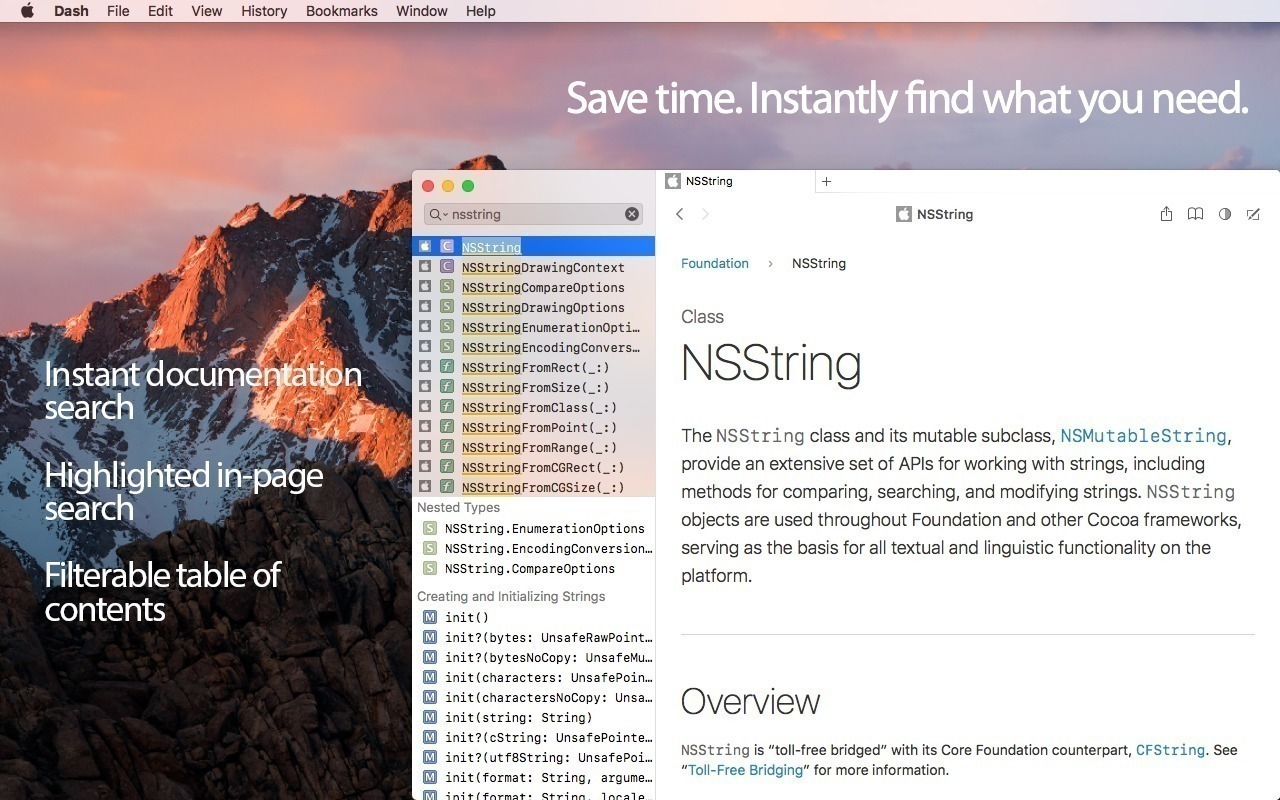 使用“dash://”URL 方案或“Lookup in Dash”系统服务轻松与任何其他应用程序集成。