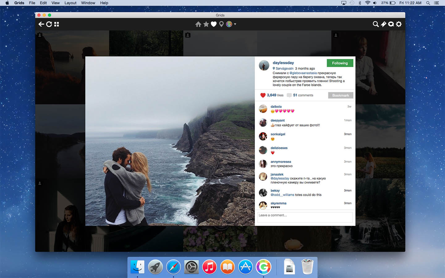 主窗口是保留的,用于显示图像的缩略图,但是,如果单击图像,则可以看到谁发​​布了图像,何时发布以及喜欢它的人数。此外,您可以阅读以前的评论,并发表自己的印象。