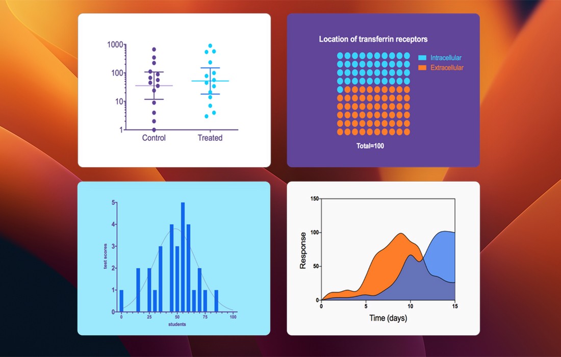 关注数据中的故事,而不要操纵软件。Prism使创建所需的图形变得容易。选择图形的类型,然后自定义任何部分-数据的排列方式,数据点的样式,标签,字体,颜色等等。自定义选项是无止境的。