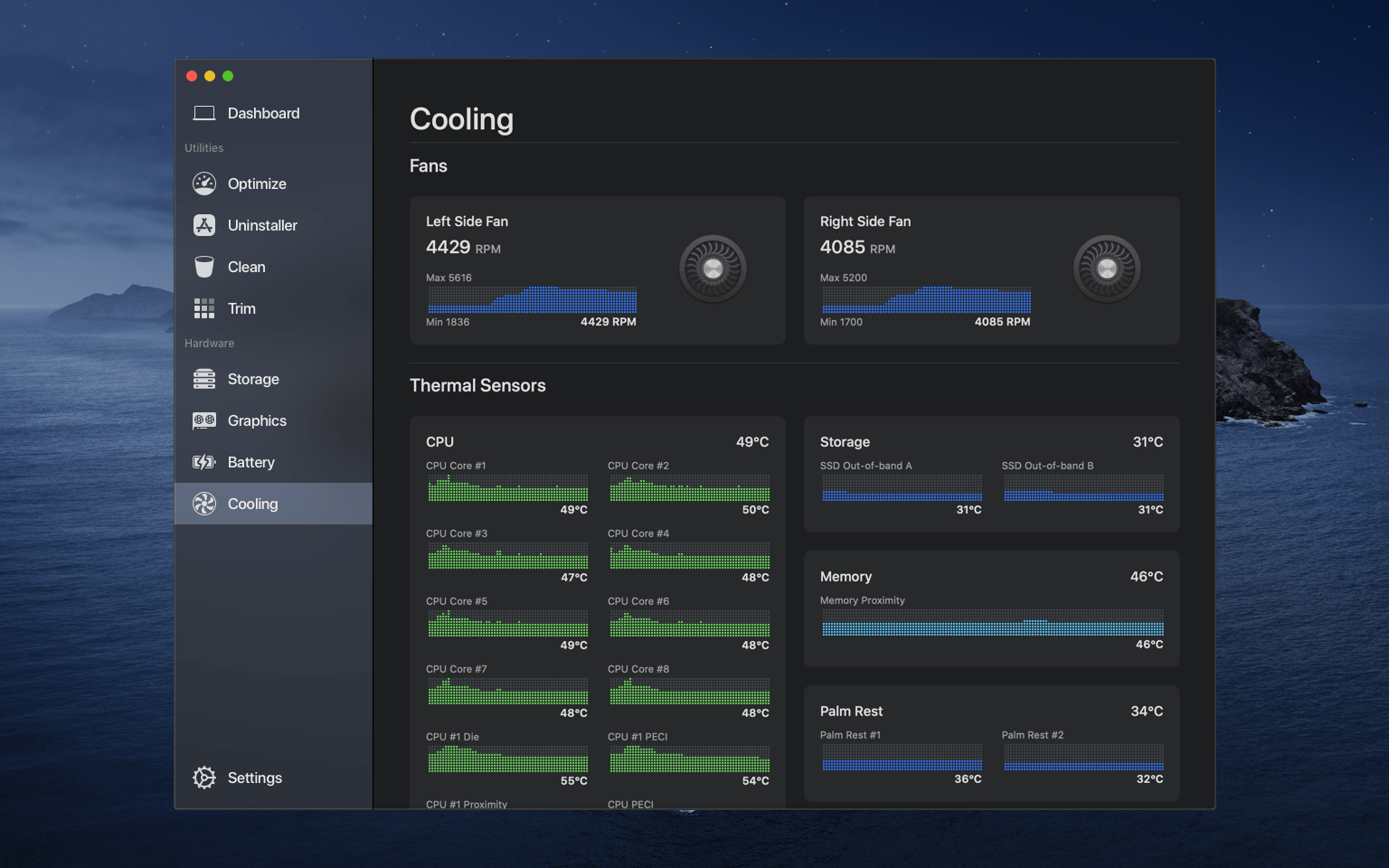 使用 Thermal Dashboard 全面了解 Mac 中的所有热传感器。实时监控您的风扇速度和温度并识别故障传感器。