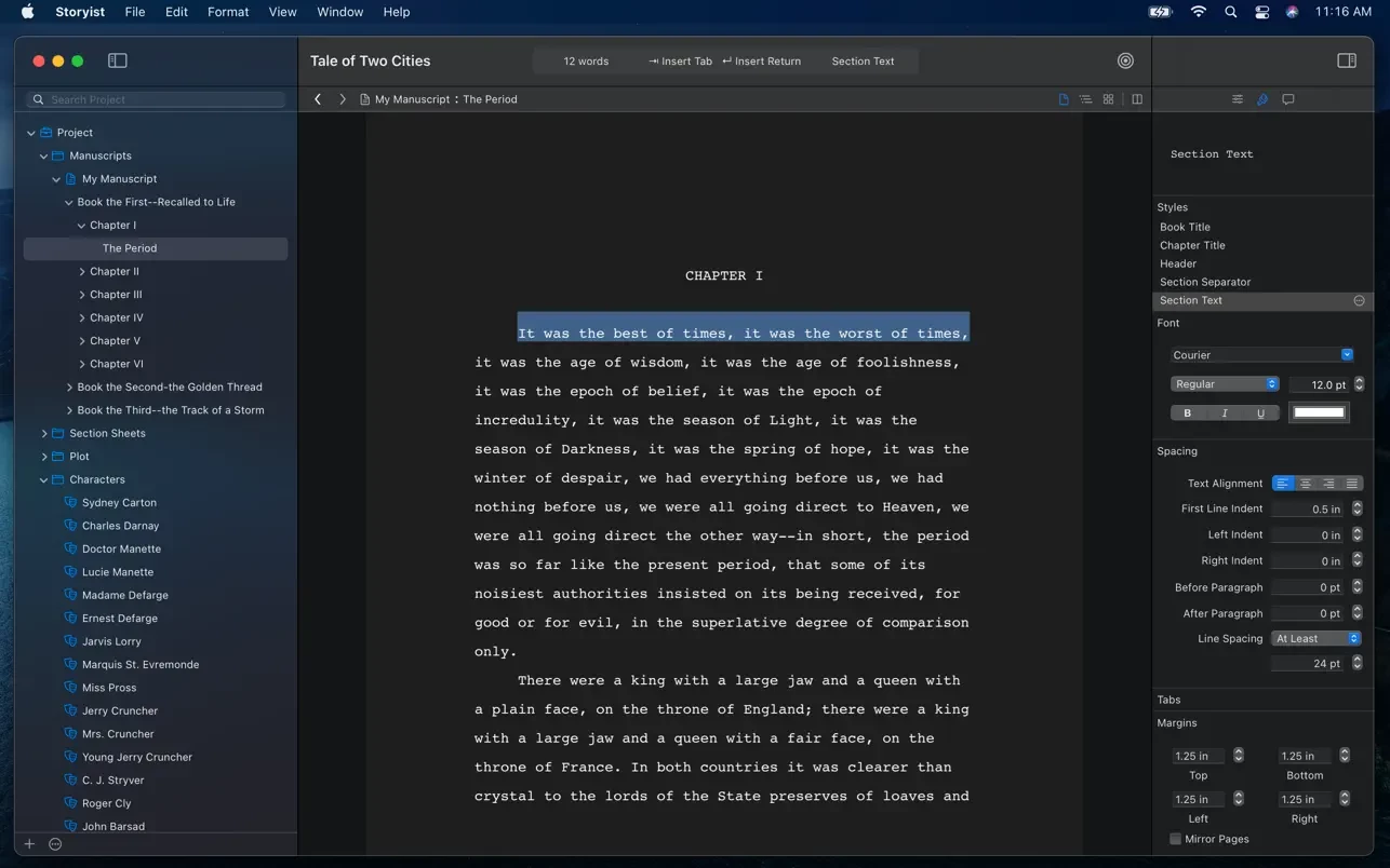 Storyist 强大的文字处理器使您能够添加页眉、页脚并使用不同的样式表。请注意,Storyist 还具有拼写检查引擎、单词计数器工具和智能报价处理工具,它们将提高您的生产力水平。