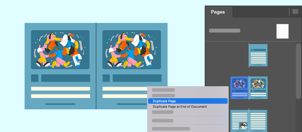 现在可在 InDesign 中重复页面或跨页,以便直接在选择后放置它们。还可选择将重复的页面或跨页放在文档的末尾。