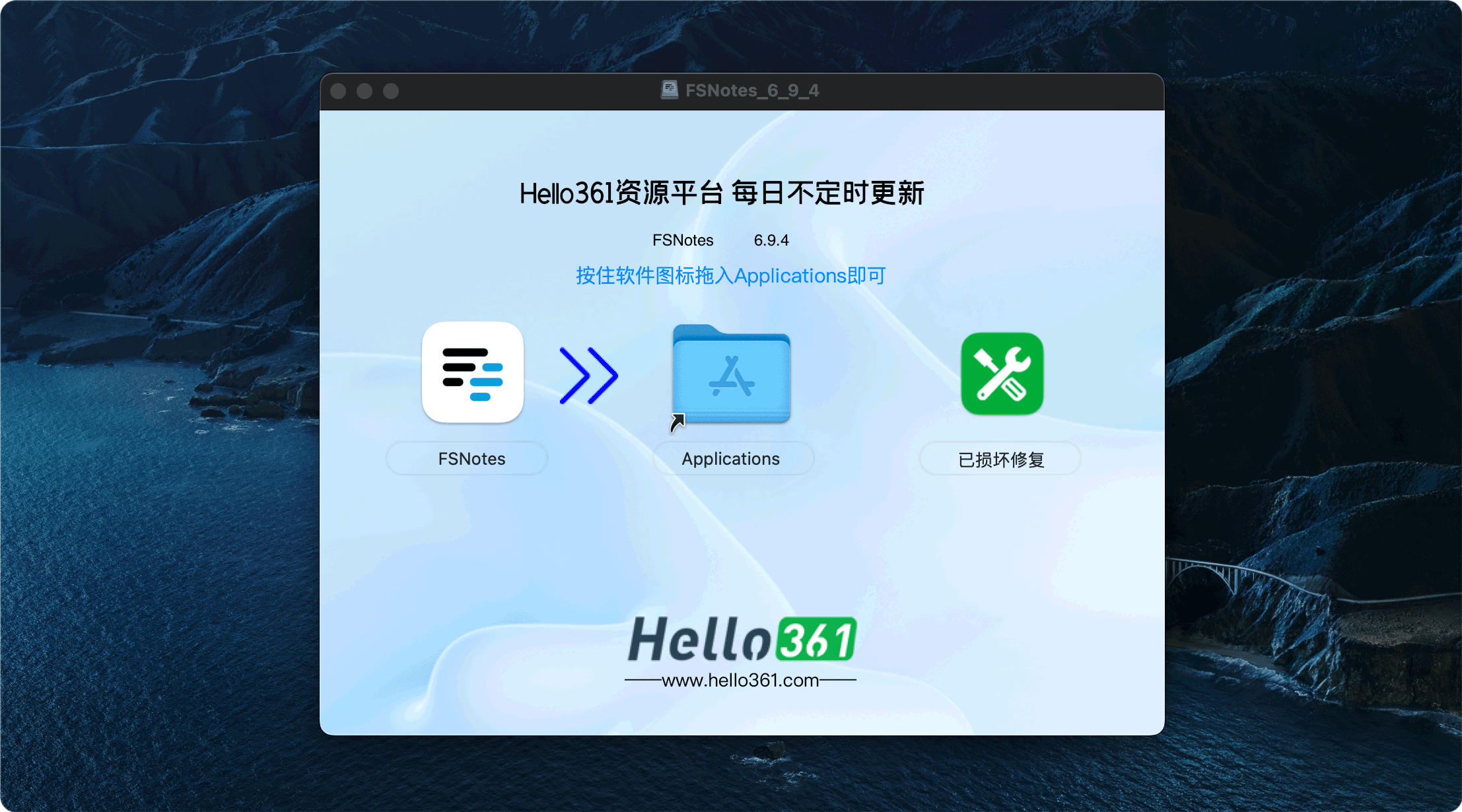 安装包下载完成后,拖动左侧的FSNotes到右侧应用程序中即可