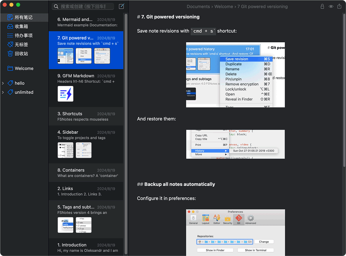 FSNotes还提供支持标签、文件夹和iCloud同步等功能,允许用户在多个设备上访问他们的笔记。它还提供了一些高级特性,比如代码高亮、内嵌图像和多个注释编辑器。测试环境:MacOS 14.6.1