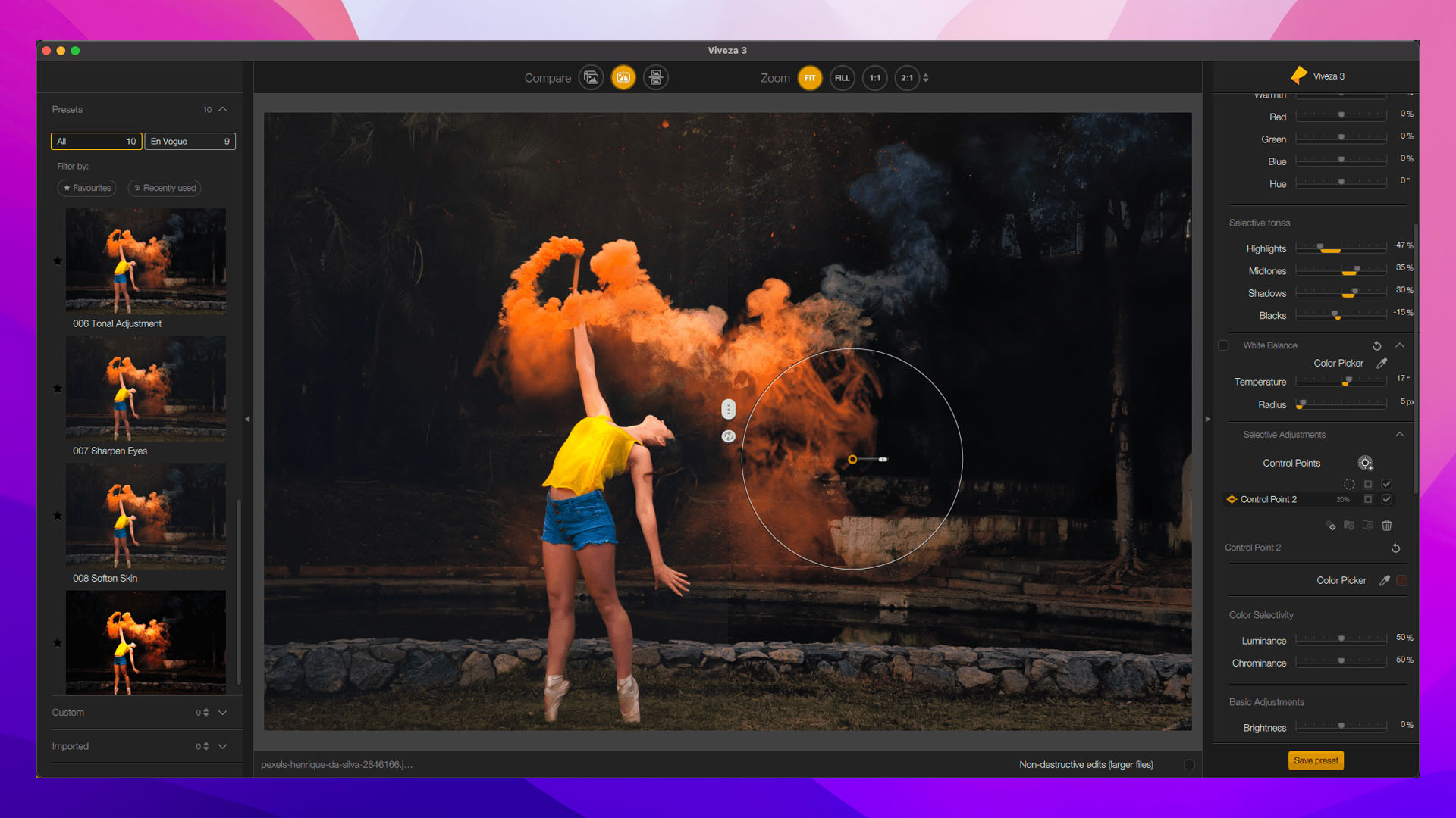 基于控制点,U POINT技术使您可以灵活地在图像的特定区域上应用本地调整和调整设置。更改可以包括诸如亮度,对比度,饱和度,结构等属性!该系统非常适合选择不完全圆形的区域,选择范围甚至可以扩展到部分阴影区域。