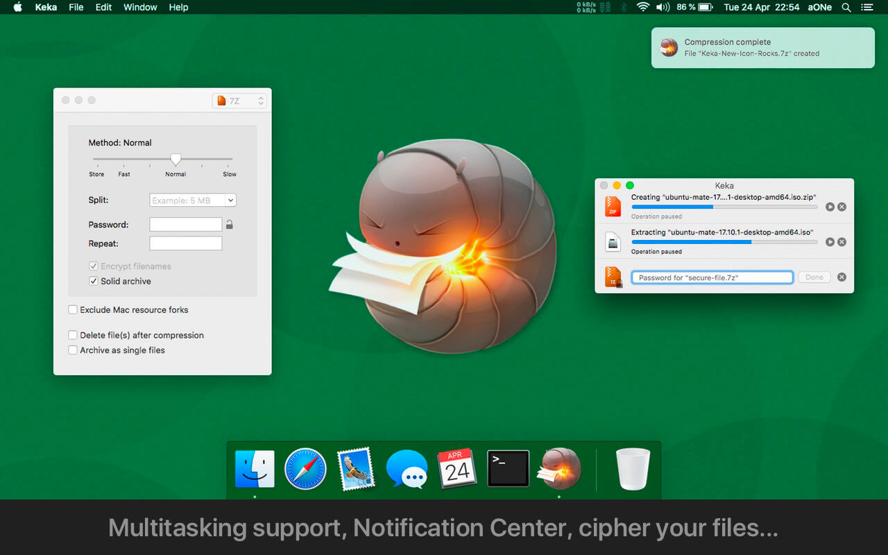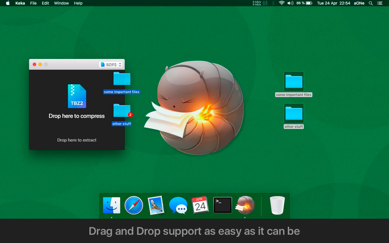 Keka for Mac 您可以以多种格式压缩任意数量的文件。分割文件并用密码保护它们现在是一个儿童游戏。只需将要压缩的文件拖放到 Dock 或主窗口中的 Keka 图标即可。