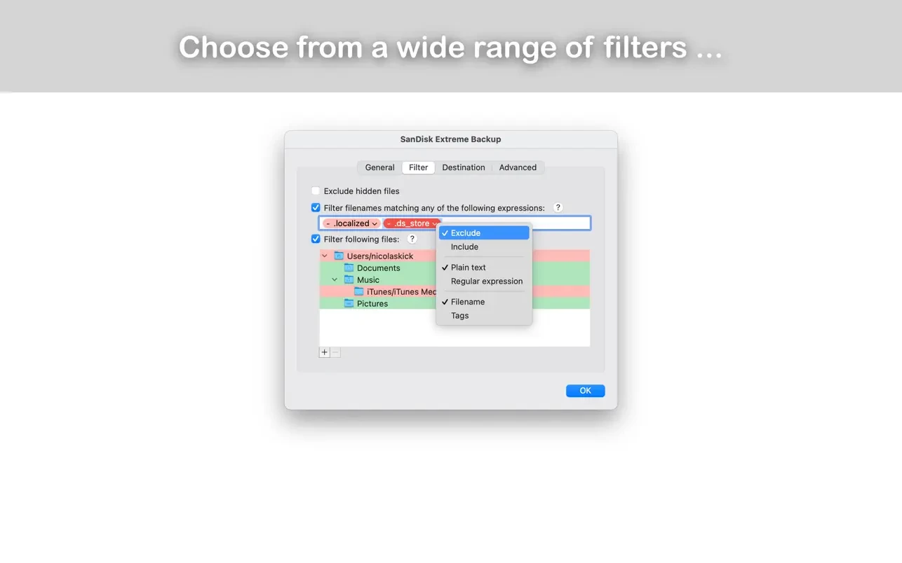 -排除隐藏文件,名称包含特定单词或匹配正则表达式的文件以及所选文件。或者排除根目录,仅指定一些包含的文件。