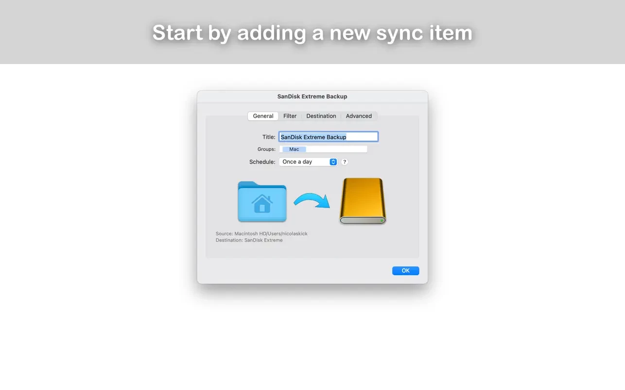 您可以根据需要创建任意数量的同步项,并分别自定义每个同步项。同步项目主要由两个文件夹组成:源文件夹和目标文件夹。您可以选择Finder中可访问的任意两个文件夹:它们可以位于Mac上,外部驱动器(如USB随身碟)上,甚至可以位于远程服务器上。在可能的选项中,您会发现: