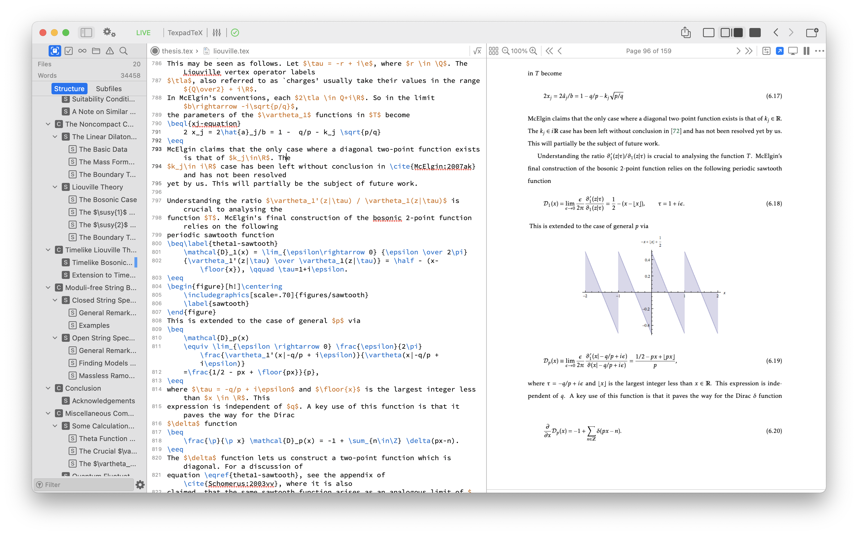 Texifier 的编辑器具有语法突出显示、主题选择、命令自动完成(包括文档中定义的命令)、\cite 和 \ref 命令的自动填充以及许多其他功能。强大的侧边栏的文档结构视图允许您轻松浏览大型多文件项目。此外,Texifier 的大纲列出了所有标签、图形、表格、待办事项,搜索窗格可以使用普通文本搜索或正则表达式搜索在整个项目中搜索和替换。