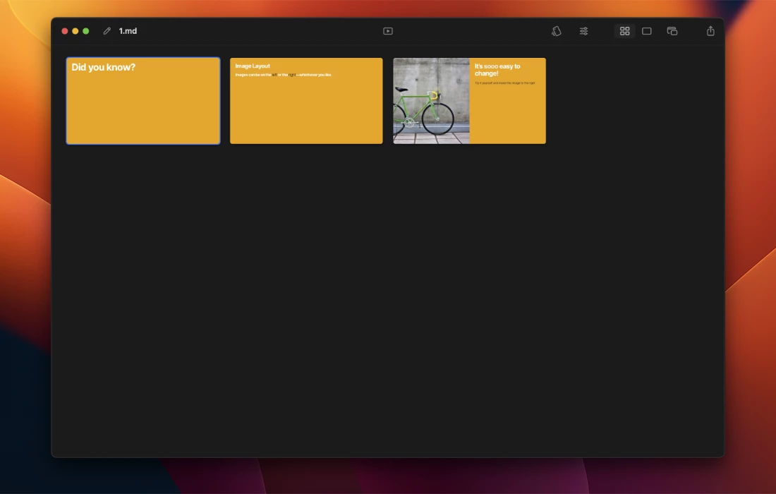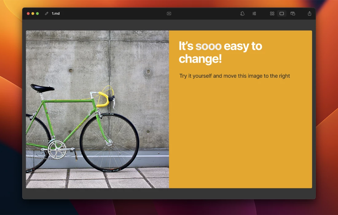 现在,您可以告诉Deckset使用每个标题自动开始一个新幻灯片,这将使您的Markdown文件保持与纯粹主义者想要的一样干净。