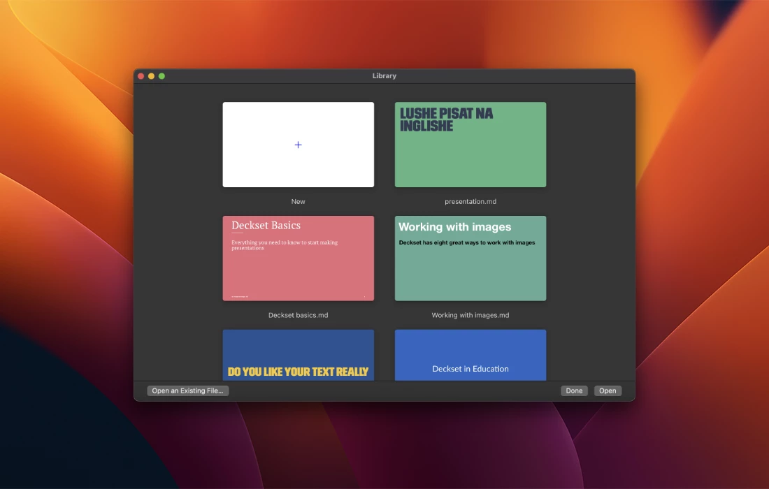 Deckset包含19个令人惊叹的主题,这些主题旨在为任何受众使用,无论是商务会议还是技术会议。