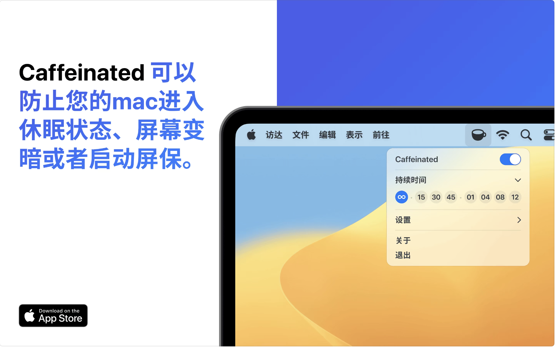 Caffeinated可以防止您的mac进入休眠状态、屏幕变暗或者启动屏保。