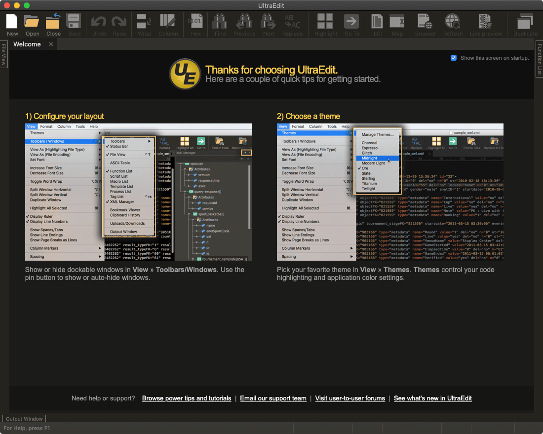 选择我们的核心主题之一或尝试我们美丽的用户贡献主题,让 UltraEdit 看起来完全符合您的要求。更进一步,修改您的主题或从头开始创建一个新主题,然后将其贡献给我们的其他用户享受。