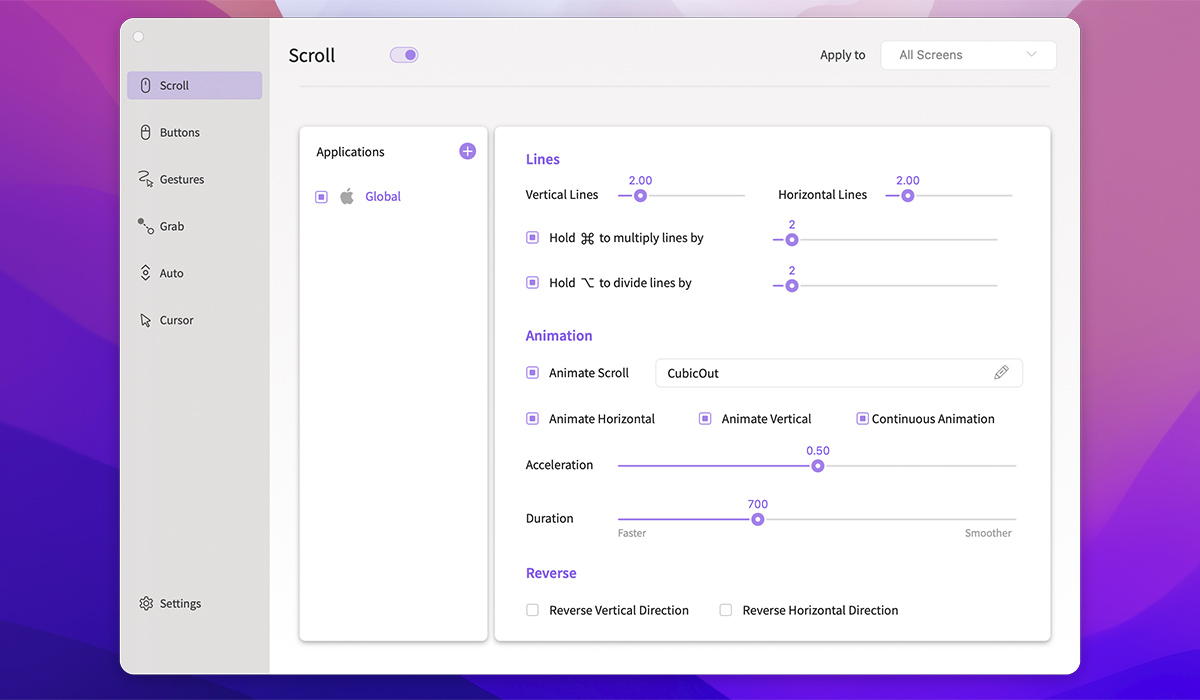 Smooze 是一款旨在填补 Apple 在 macOS 鼠标定制部门留下的空白的应用程序。一旦启动,Smooze 将添加一个带有菜单的状态栏项目,使您可以将应用程序设置为在登录时自动启动,以及禁用其自定义滚动引擎和按钮操作,并访问其选项。