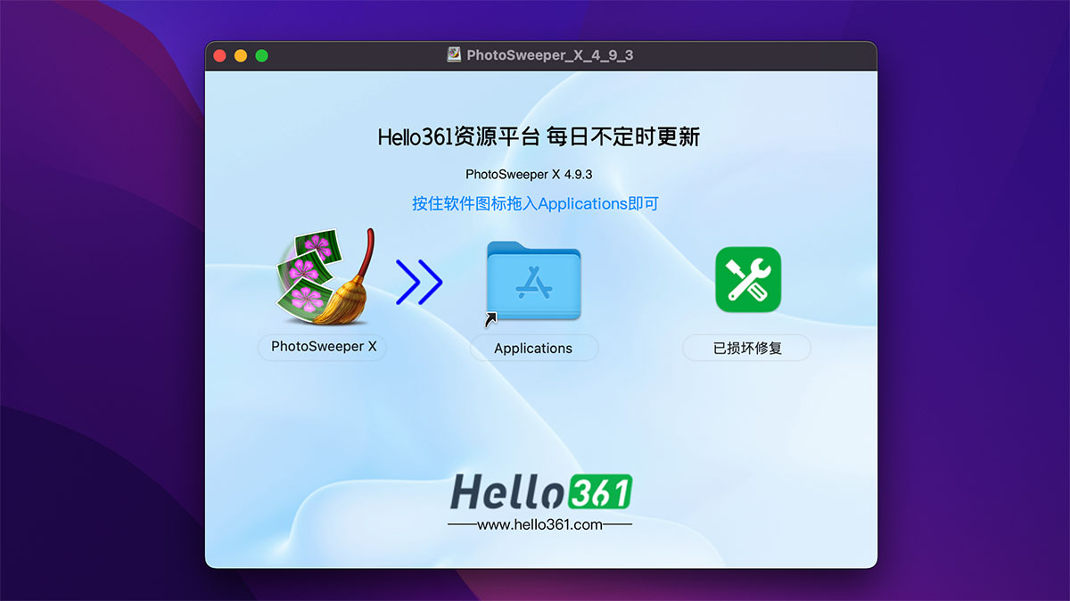 将左侧的PhotoSweeper X拖动到右侧的应用程序中,如图