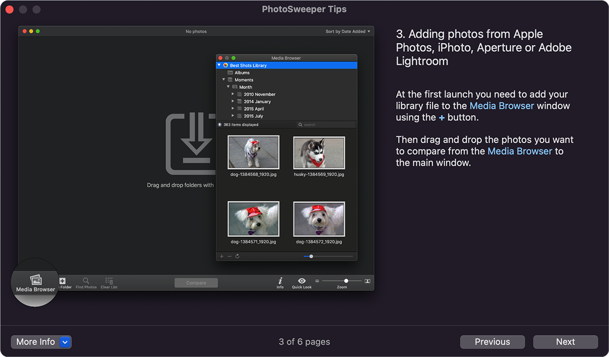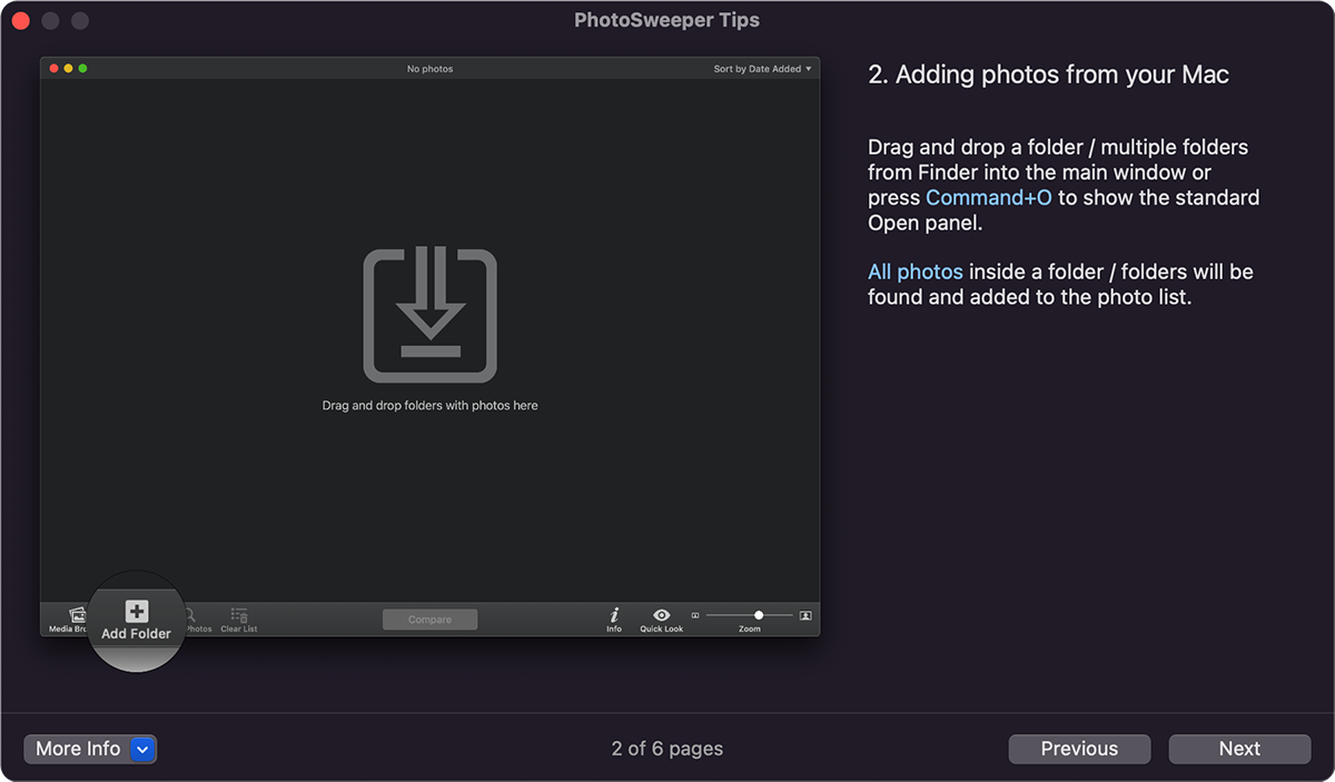 只需从你的Mac上拖放文件夹,让PhotoSweeper找到里面的所有照片。通过媒体浏览器窗口从您的照片、Capture One或Lightroom Classic库中添加更多照片。