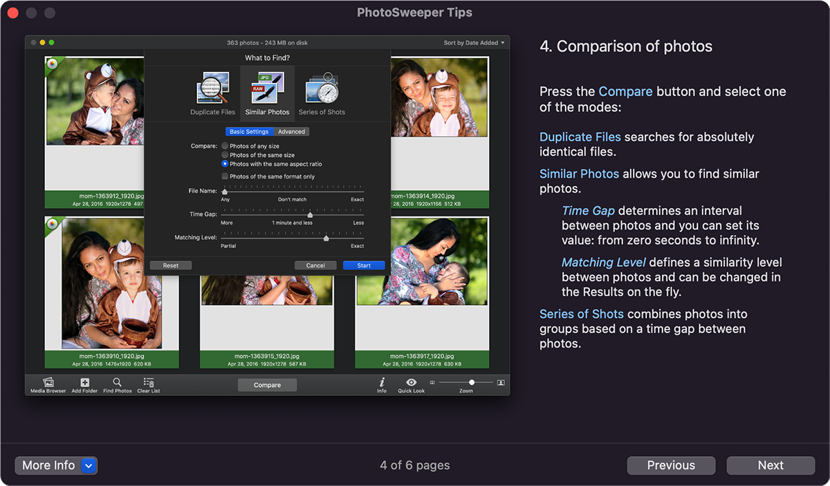 强大的多重设置,可轻松找到重复、相似的照片、系列镜头。该应用程序可以找到重复的照片,甚至是那些在Photoshop等外部程序中编辑过的照片,而不考虑图像大小或格式。