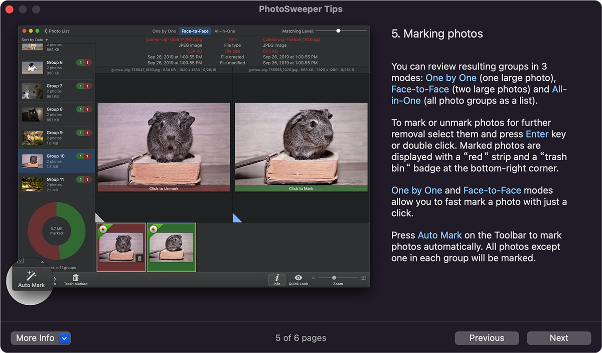 PhotoSweeper提供3种模式来查看结果。”一张一张”,”面对面”–一张或两张大照片,只需点击一下就有机会标记照片,”合二为一”–所有重复的组都在一个列表中。