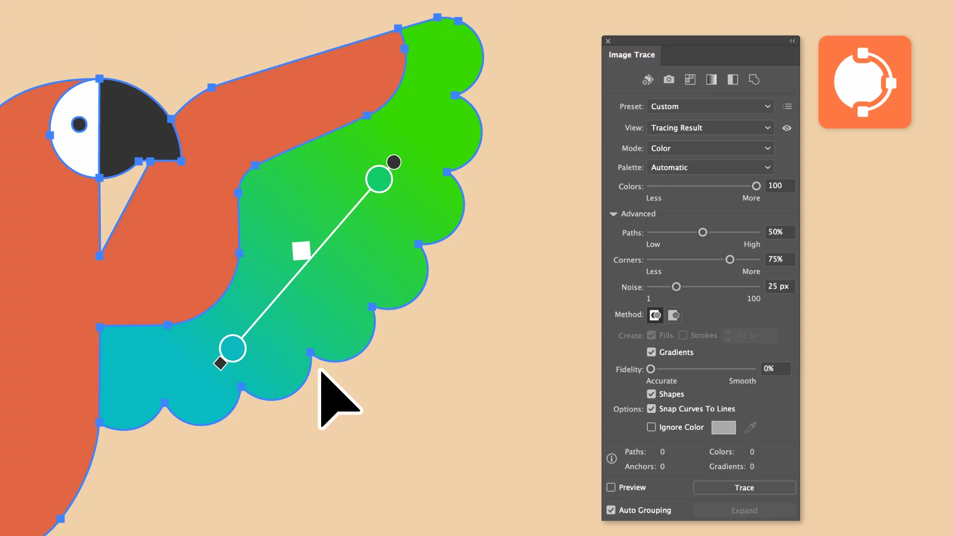 使用较少的锚点以及将路径排列到逻辑组的自动分组选项,描摹结果更易于编辑。此外,形状选项将圆形、正方形和矩形作为实时形状进行描摹,从而进一步简化编辑过程。