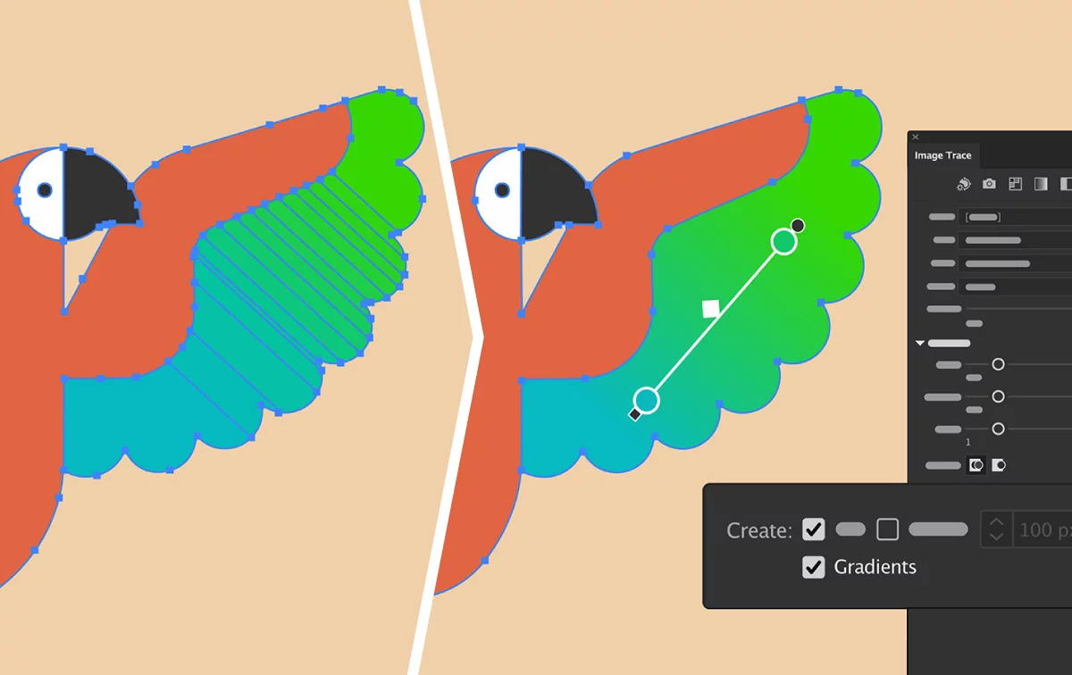 在颜色模式下描摹时,透明度选项会防止将透明背景描摹为白色。在颜色或灰度模式下,渐变选项会根据您设置的强度检测和跟踪线性渐变。描摹后,您可以使用渐变 工具轻松优化渐变。