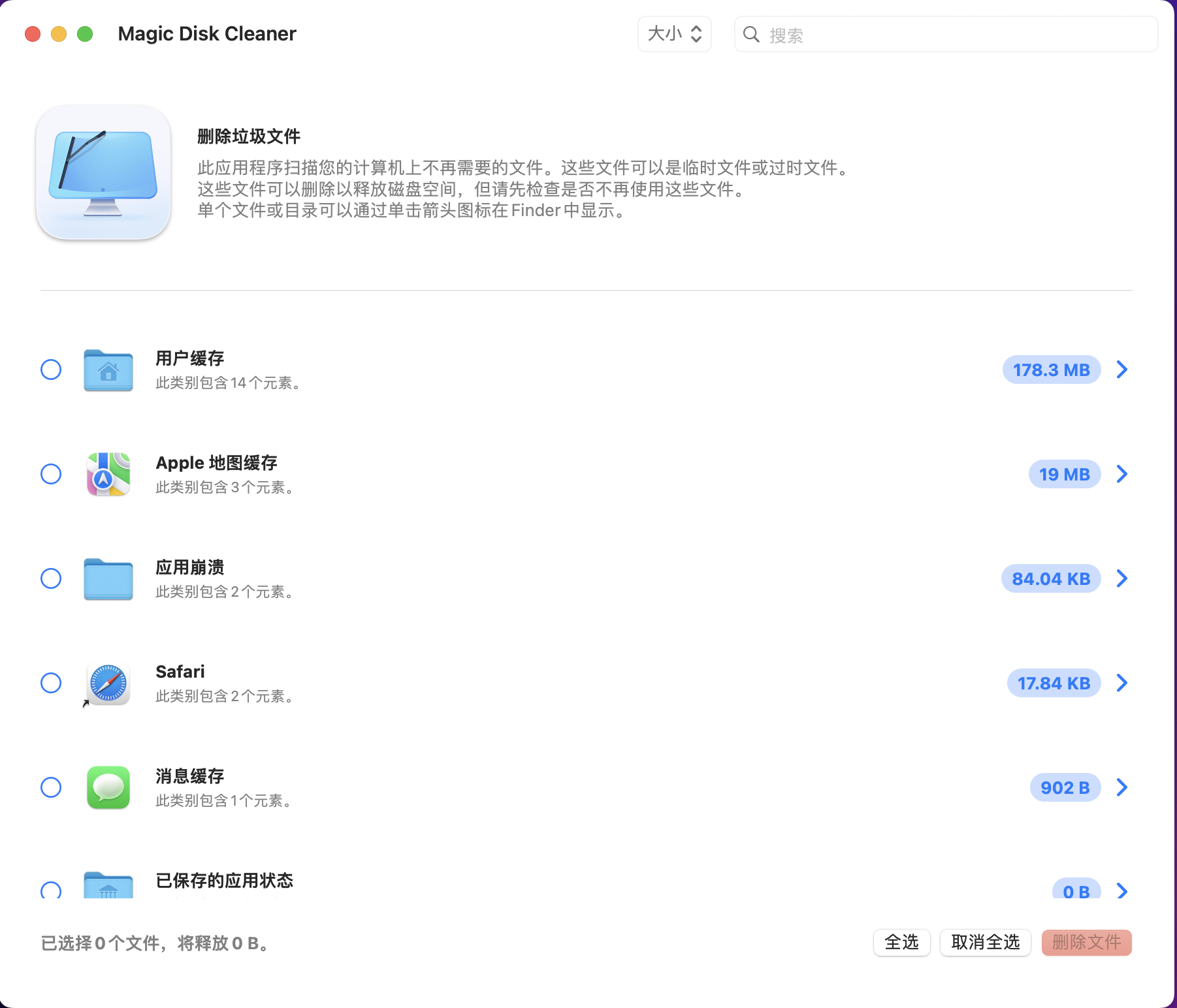 Magic Disk Cleaner for Mac是一款功能强大的系统清理软件,它可以帮助您清理电脑硬盘空间,从而提高计算机的性能和速度。以下是该软件的主要特点: