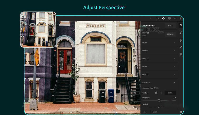 确保一切都排成一行。通过使用强大的直立、引导直立和几何滑块工具调整图像的透视,创建具有直线的超清晰照片
