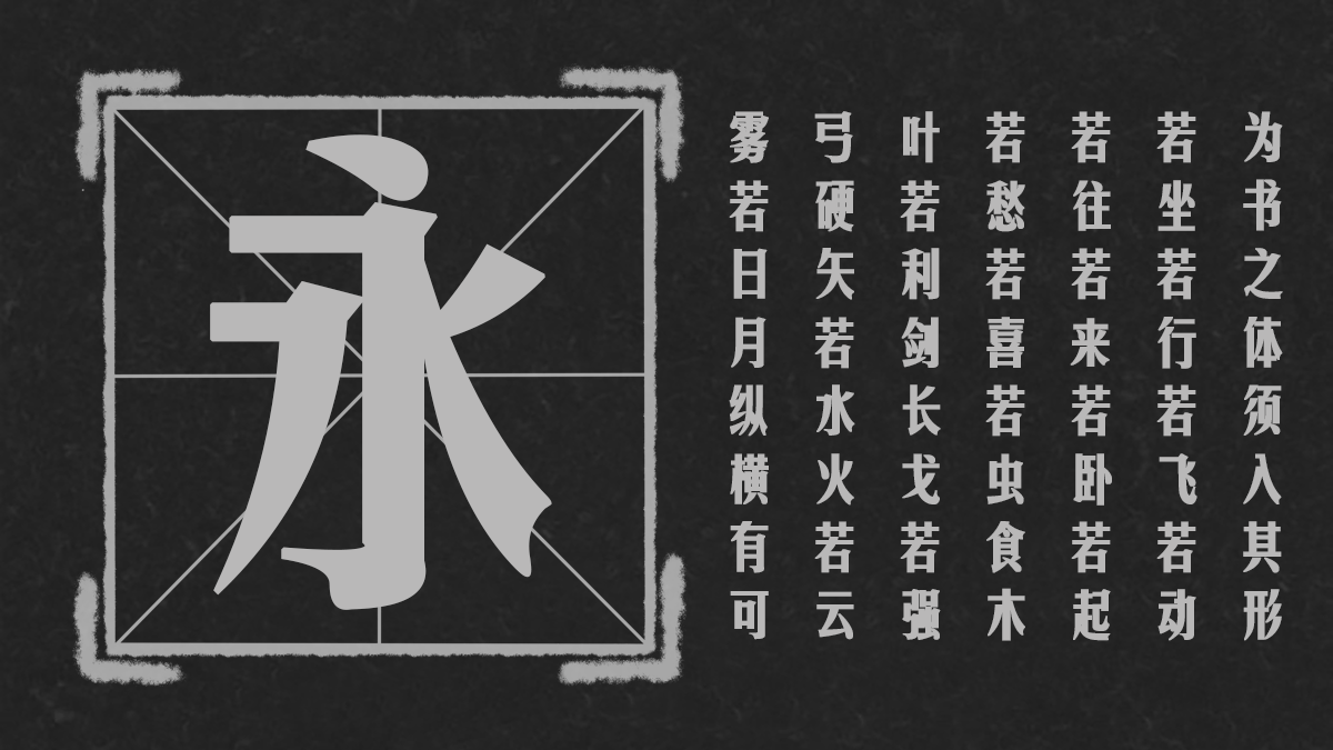 方正美黑结合了黑体与宋体的特征,既有黑体粗壮的笔形,又有宋体折笔和运笔的特征。其字形整体修长,笔画较粗。细节上装饰意味较强,比如捺画的笔锋有大曲率内凹,但整体风格质朴敛静,拙中见巧。在20世纪90年代之前,这种字形风格常被用于黑板报和印刷品中,因此有着明显的时代特征。