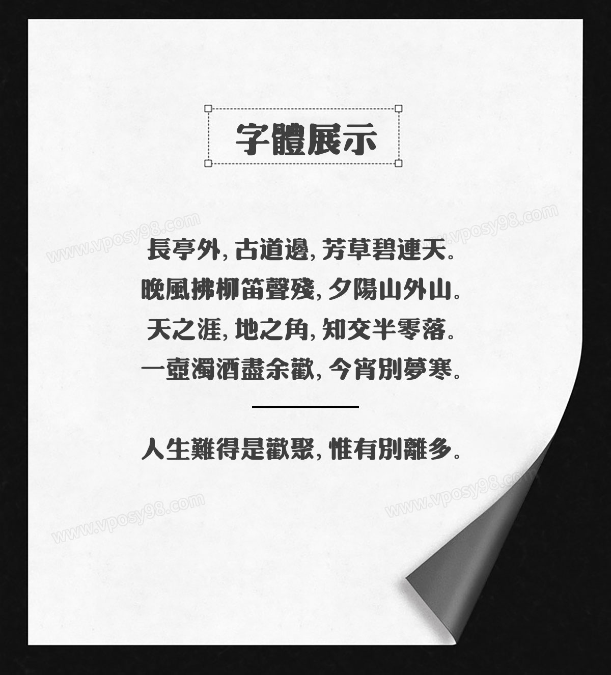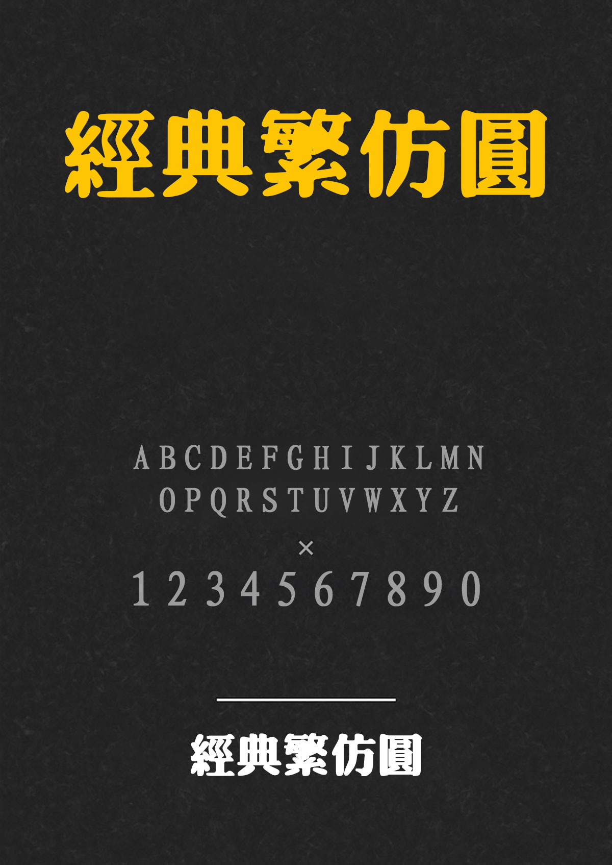 经典繁仿圆是一款以圆体字的特色打造的经典字体中的仿宋体,这款仿宋体看起来更加的圆润,给人赏心悦目的感觉。仿宋体是一种采用宋体结构、楷书笔画的较为清秀挺拔的字体,笔画横竖粗细均匀,常用于排印副标题、诗词短文、批注、引文等,在一些读物中也用来排印正文部分。而仿圆体中拥有仿宋字体的所有特色,而且字体更为圆润,看起来更为舒适!