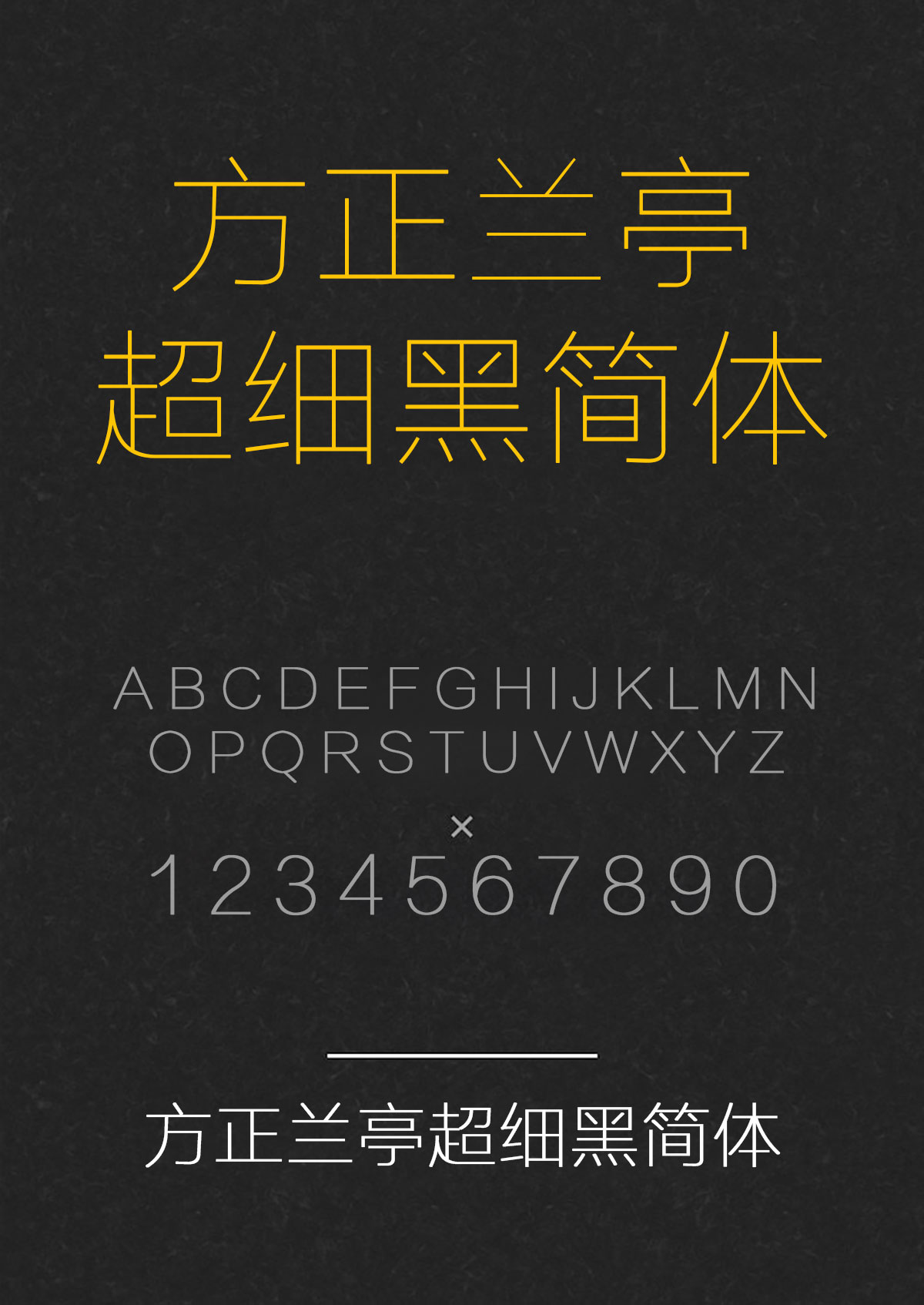 方正兰亭超细黑简体是一款非常漂亮的艺术字体,方正兰亭超细黑简体广泛用于各种书刊、画册、包装、字体设计的设计中,方正兰亭超细黑简体是TrueType字体,方正兰亭超细黑简体也是报纸和杂志和书籍中常用的字体, 设计师常用字体,主要用于海报、个性促进品牌标志设计、字体设计、等环境。