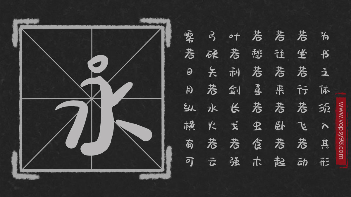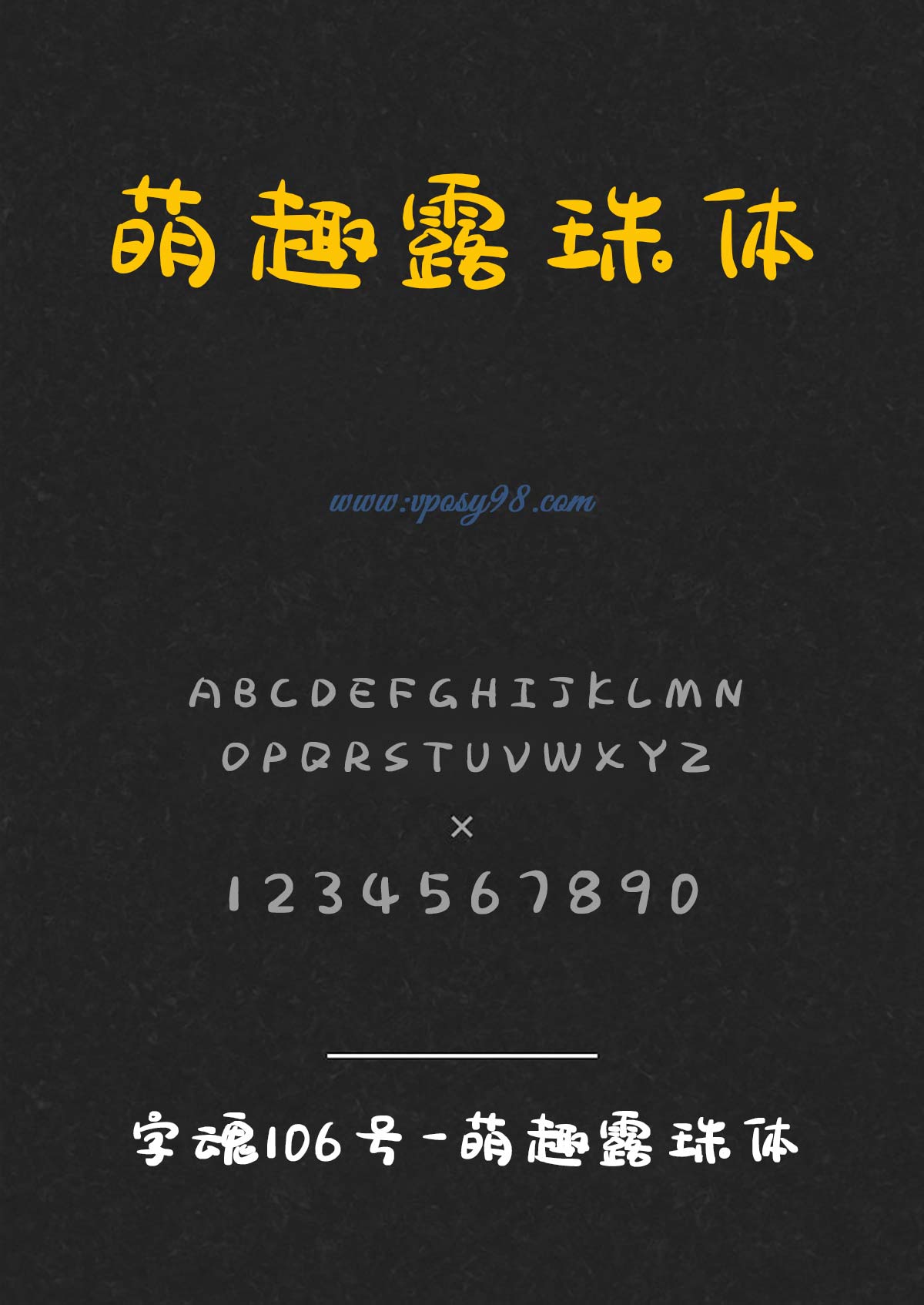 字魂106号-萌趣露珠体一款非常可爱的创意字体。这款字在书写的过程中对部分笔画进行简化,撇捺简单直接,点画加入了圆圈状的装饰设计,字的起笔、运笔和收笔处都带有一定的弧度,折笔处以圆代方,变“口”为圆。