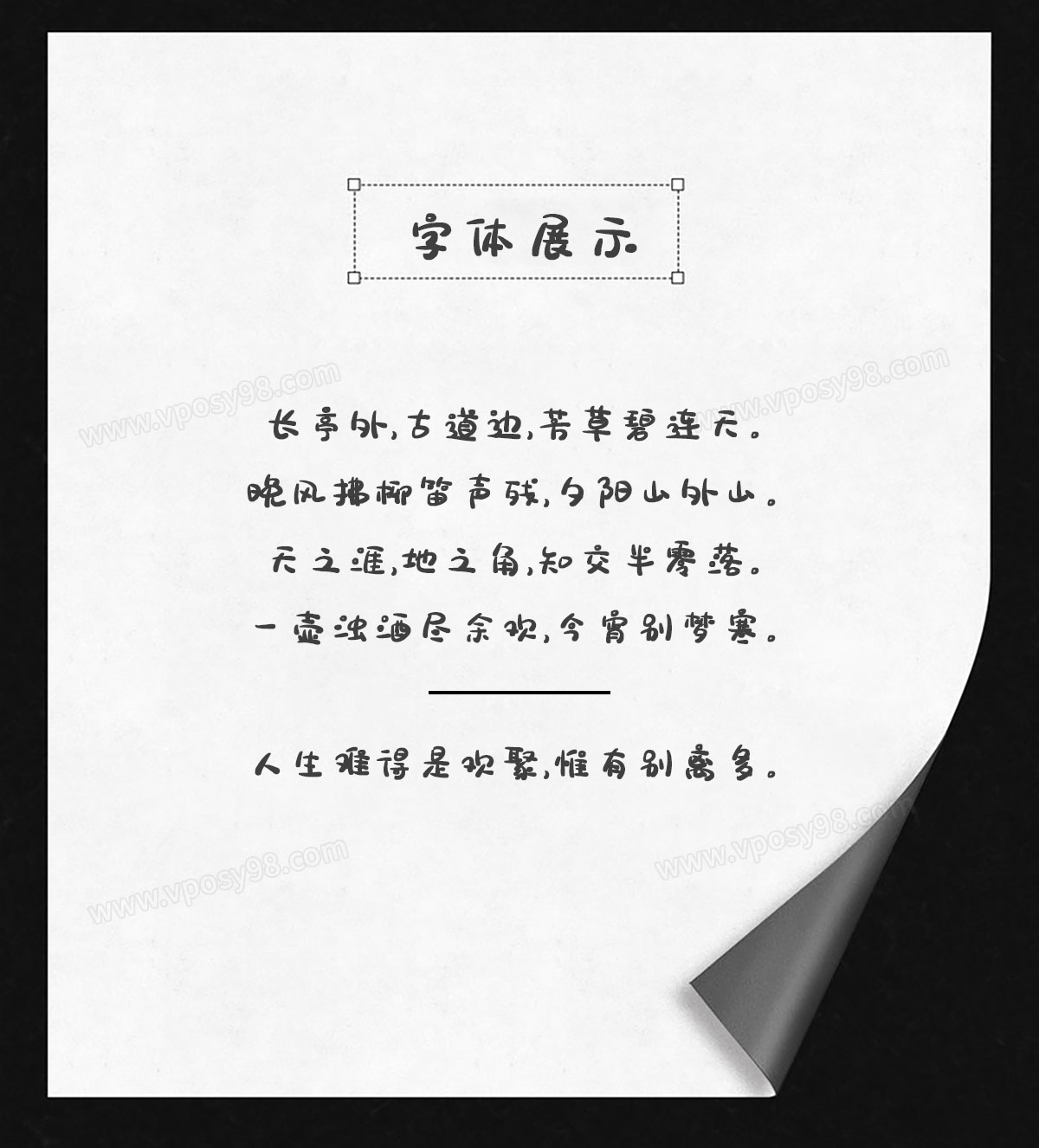 字体的结构灵动活泼,整个字看起来比较的有趣可爱,字体在显示中带有一丝丝露珠的感觉,其个性活泼富有趣味性,适用于少儿类的书刊、品牌广告和产品包装设计。