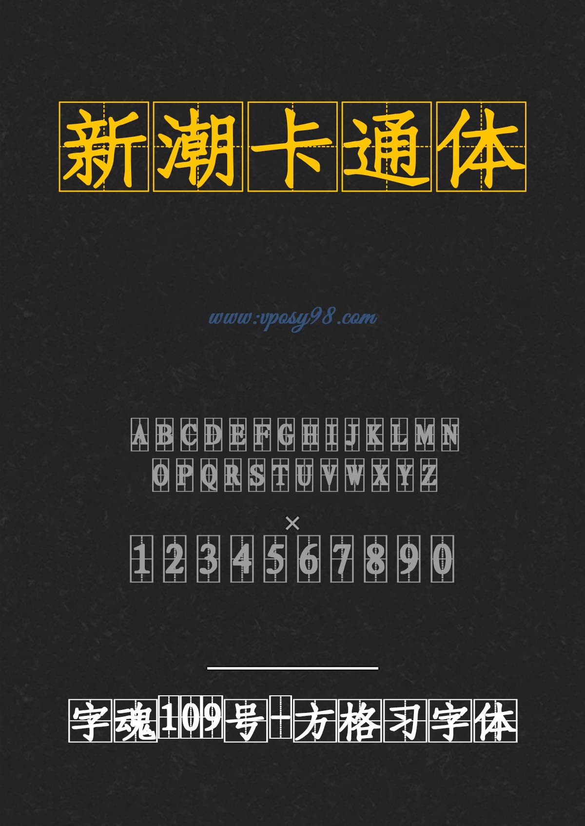 字魂109号-方格习字体,是一款比较有个性的字体。该字体有个特点就是,输入的每个字都会自带方格效果,有种“小学生”写字的既视感,这种字体也非常适合在字帖和书法练习中使用,变现的形式也非常的落落大方,不拖泥带水。