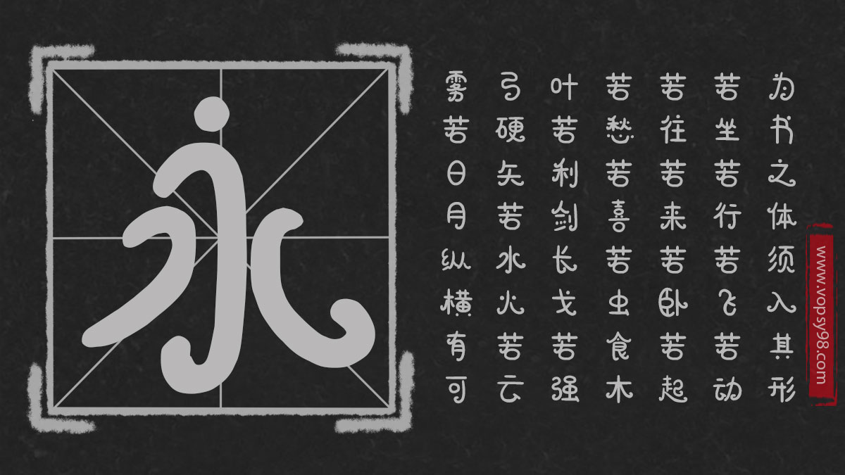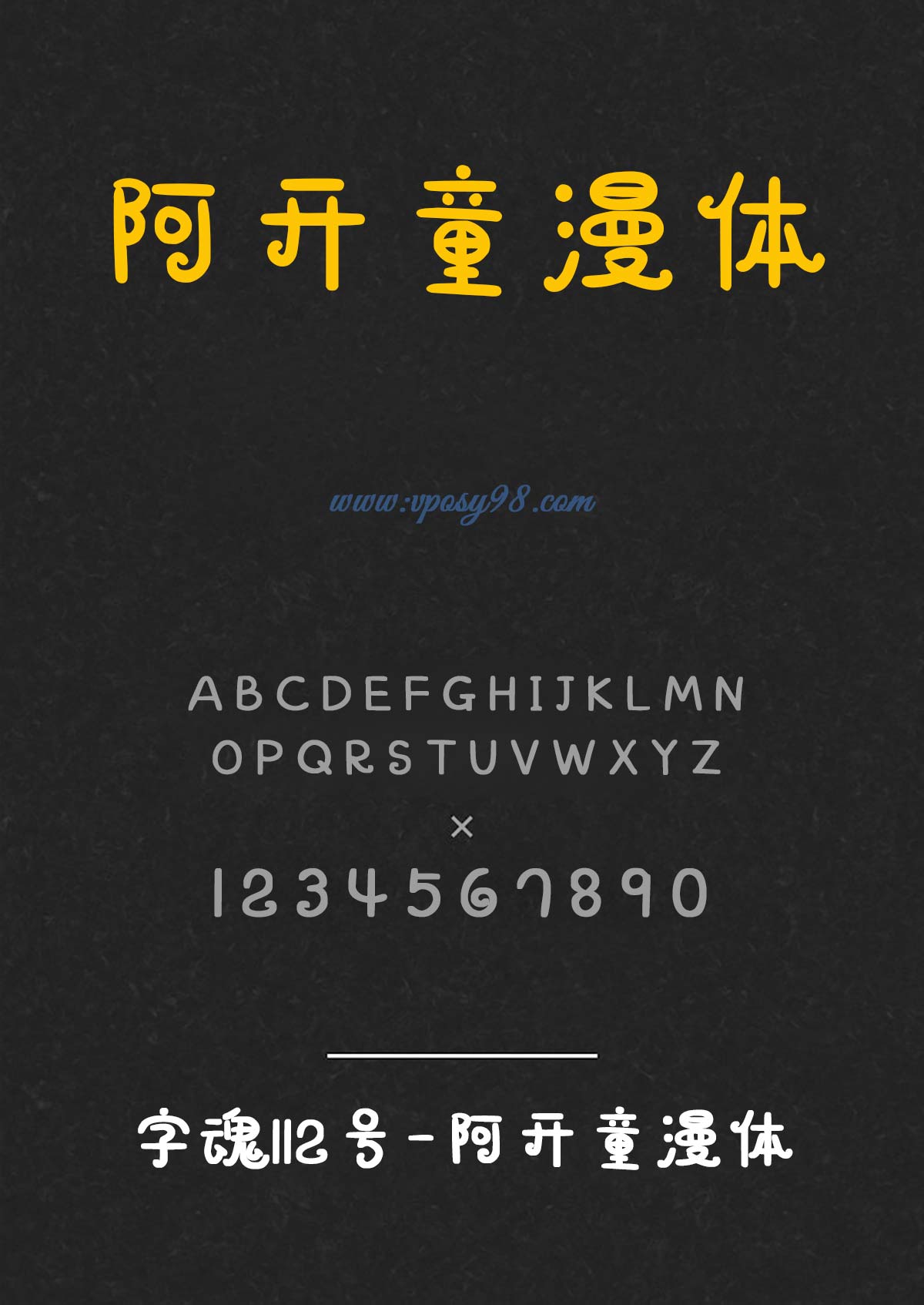 字魂112号-阿开童漫体是一款可爱的创意字,字体结构巧妙活泼、大小均匀,重心平稳。字体的笔画设计非常的具有趣味性,点笔画多数呈圆点状,字体的部分撇笔画和捺笔画设计成卷曲的小挂件,外形与其他部分融为一体,个性中透出一丝顽皮,字的线条柔美,起笔和收笔处婉曲而利落,字体方中见圆,圆中见方,做到了过渡自然的折转结合。