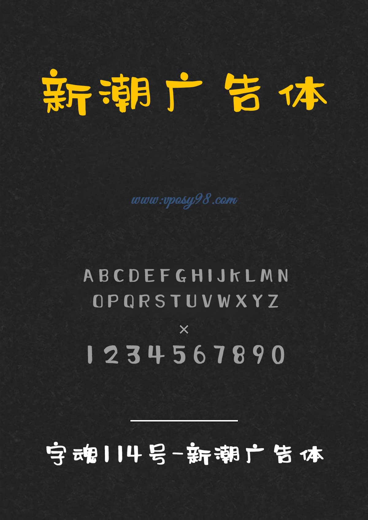 字魂114号-新潮广告体是一款颇具创意的艺术字体,这款字体笔触较为粗细适中,字体结构小巧,具有很好的视觉感。字魂114号-新潮广告体字体字库是一款让人赏心悦目、百看不厌的中文字体,适合各类广告和产品包装设计应用。