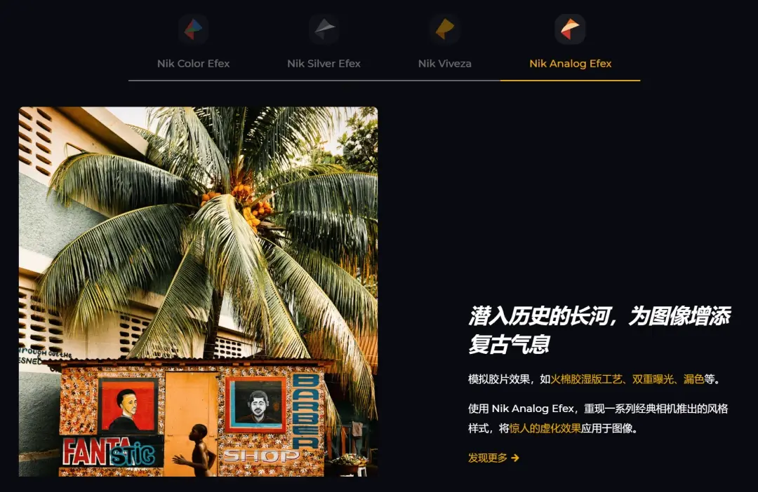 Nik Analog Efex 是重现可追溯到摄影初期的大气氛围的唯一方法。Nik Analog Efex 让您可以独家访问一组独特的乐器和效果,可以立即创建过去的“外观”。使用经典相机、老式镜头和早已被遗忘的胶卷技术重新构想您的摄影作品。应用特殊效果,让您的照片具有经典摄影时代的光泽。超过 80 种工具和特殊效果可供您使用,让您的图像看起来像真正的复古照片。