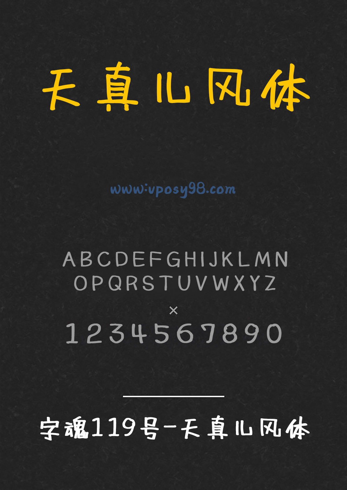 字魂119号-天真儿风体,是一款非常天真可爱的字体哦,这款字体拥有各种非常逗趣的画风,在可爱萌萌哒的风格上用的较多。