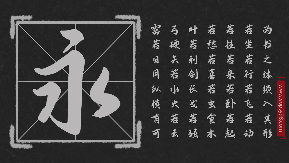 字体笔画破方为圆,把转折处写成流动性很强的圆弧形状,字中的横平不是传统意义上的平直,而是横画平稳,横在右上斜5–10度,字形上部笔画书写时相对比较紧凑,下部书写时较为疏朗,适合用于书籍、报刊、杂志的标题和宣传装饰。