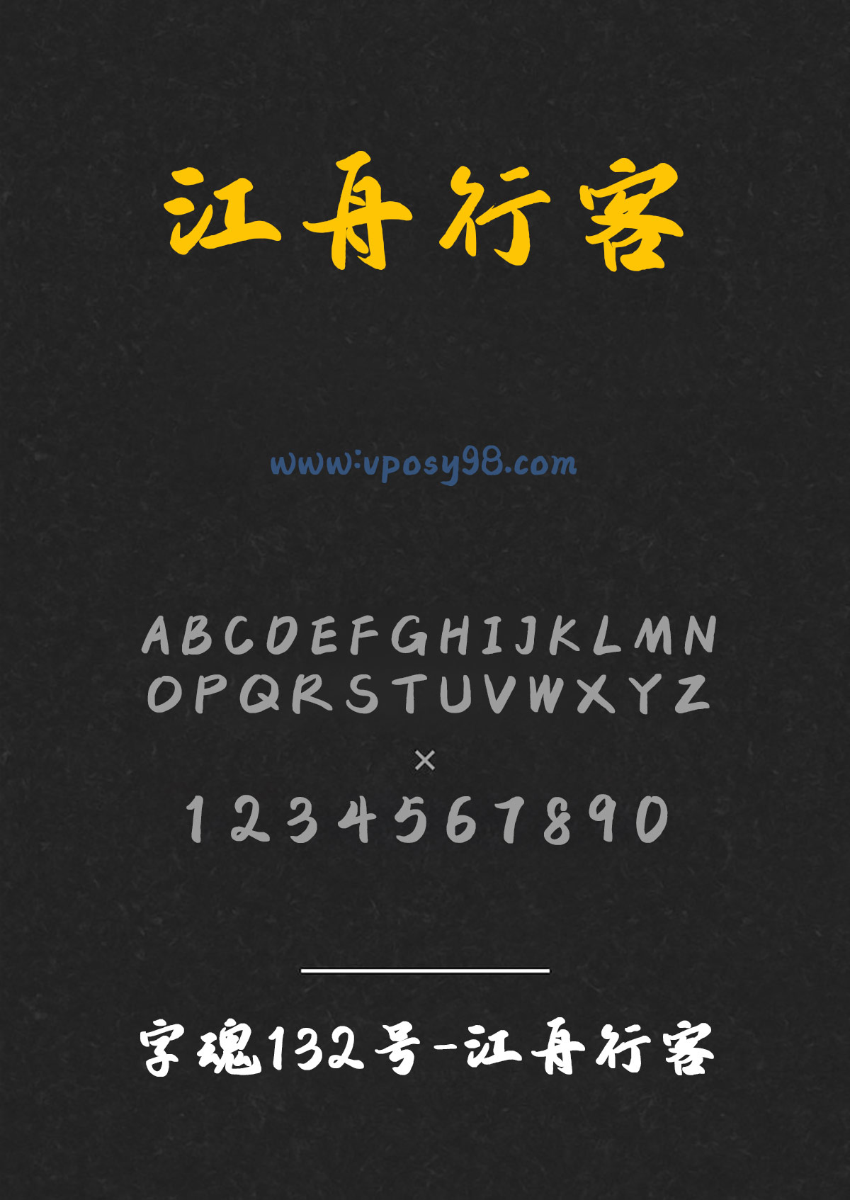 字魂132号-江舟行客字体是一款优秀的手写字,该字体行笔流畅,字迹洒脱,具有浓厚的书法韵味,字体结构均衡匀称,用笔严谨,洋溢着书法美感。