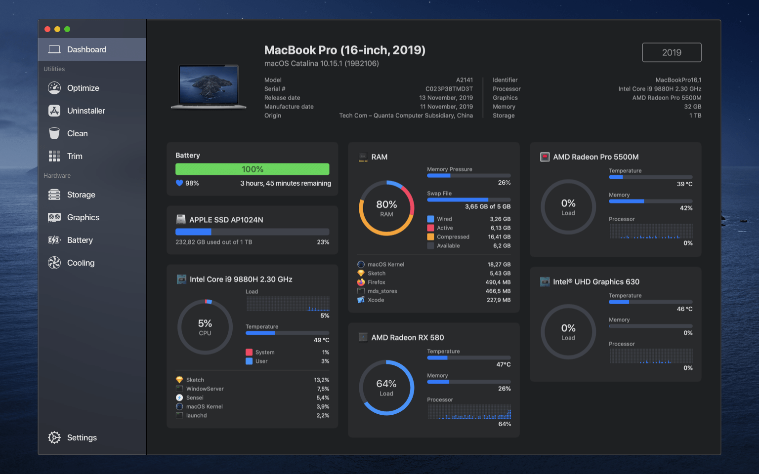 Sensei for Mac是一款涵盖软件和硬件的应用程序,比Mac优化类别中的其他应用程序具有更多功能。它具有清理磁盘,卸载应用程序,分析电池和磁盘运行状况,监视CPU / GPU / RAM统计信息,优化启动启动速度等功能。