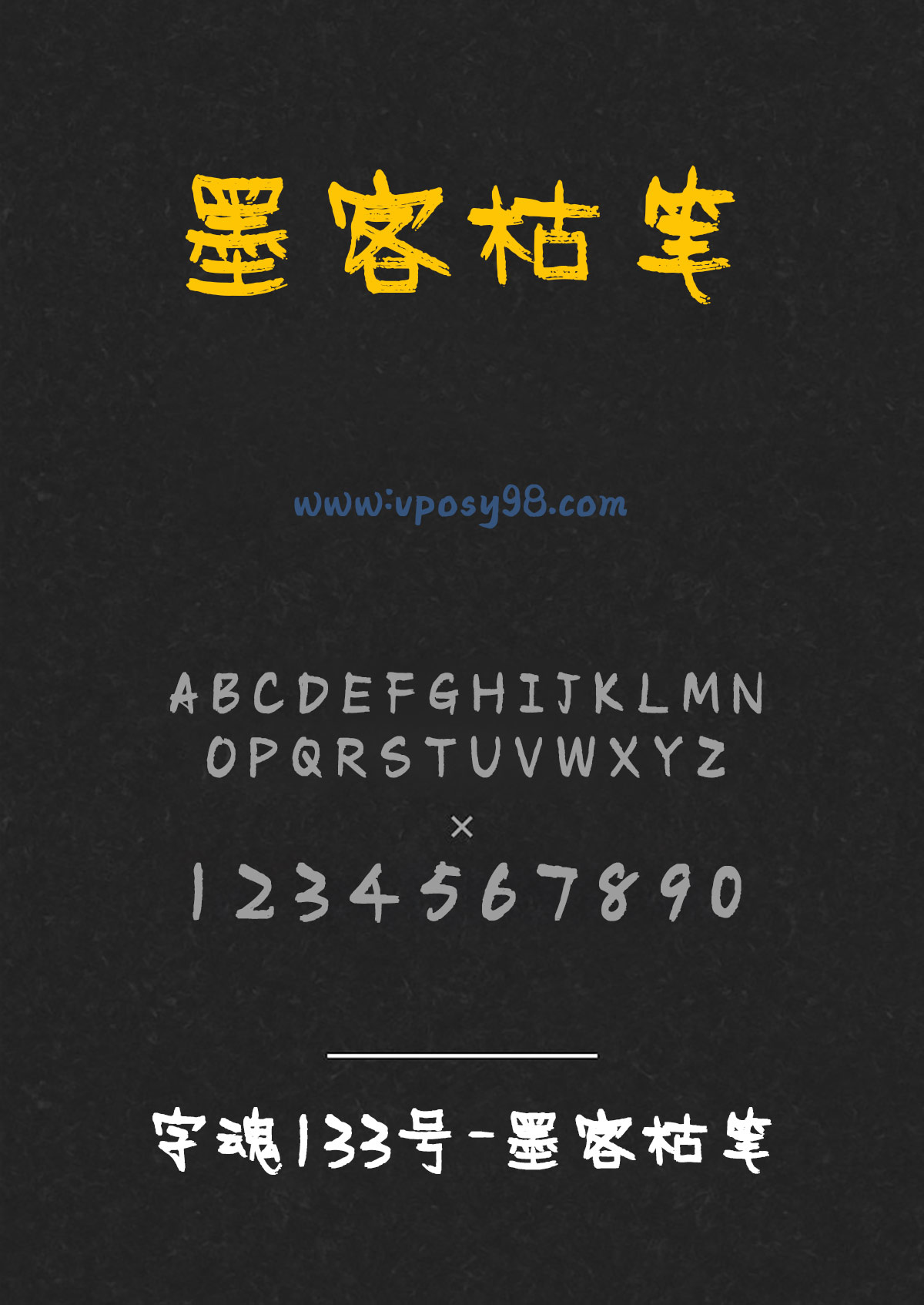 字魂133号-墨客枯笔字体以行楷为基准,尽可能保留笔画的丰富性,比如粗细变化、相同偏旁部首的变化以及飞白的效果等。这套既符合传统书法的笔法与结构,又能具有视觉设计张力的书法标题字体,主要适用于广告、包装、影视剧的标题等。